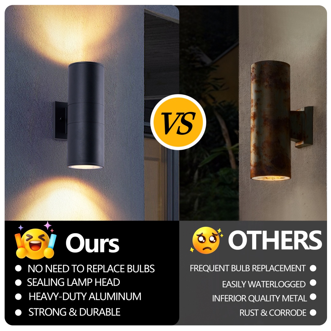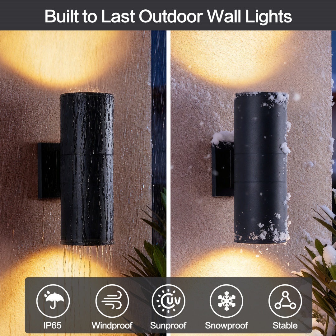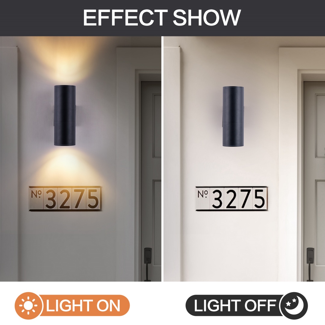 IP65 rated outdoor wall sconce, rust-resistant with aluminum cylinder body, bulbs NOT included.Patented waterproof design with cap shape upper cover and plug shape lower cover.Easy to install with 2-piece rotatable mounting bracket and fixing nuts on wall plate front side.WATERPROOF, RUST-RESISTANT AND WEATHER-RESISTANT - The tough aluminium body and glass end diffusers ensure the fixture is able to withstand all weather condition.Light is dispersed from both ends of the fitting creating a beautiful lighting effect and is suitable for indoor & outdoor use