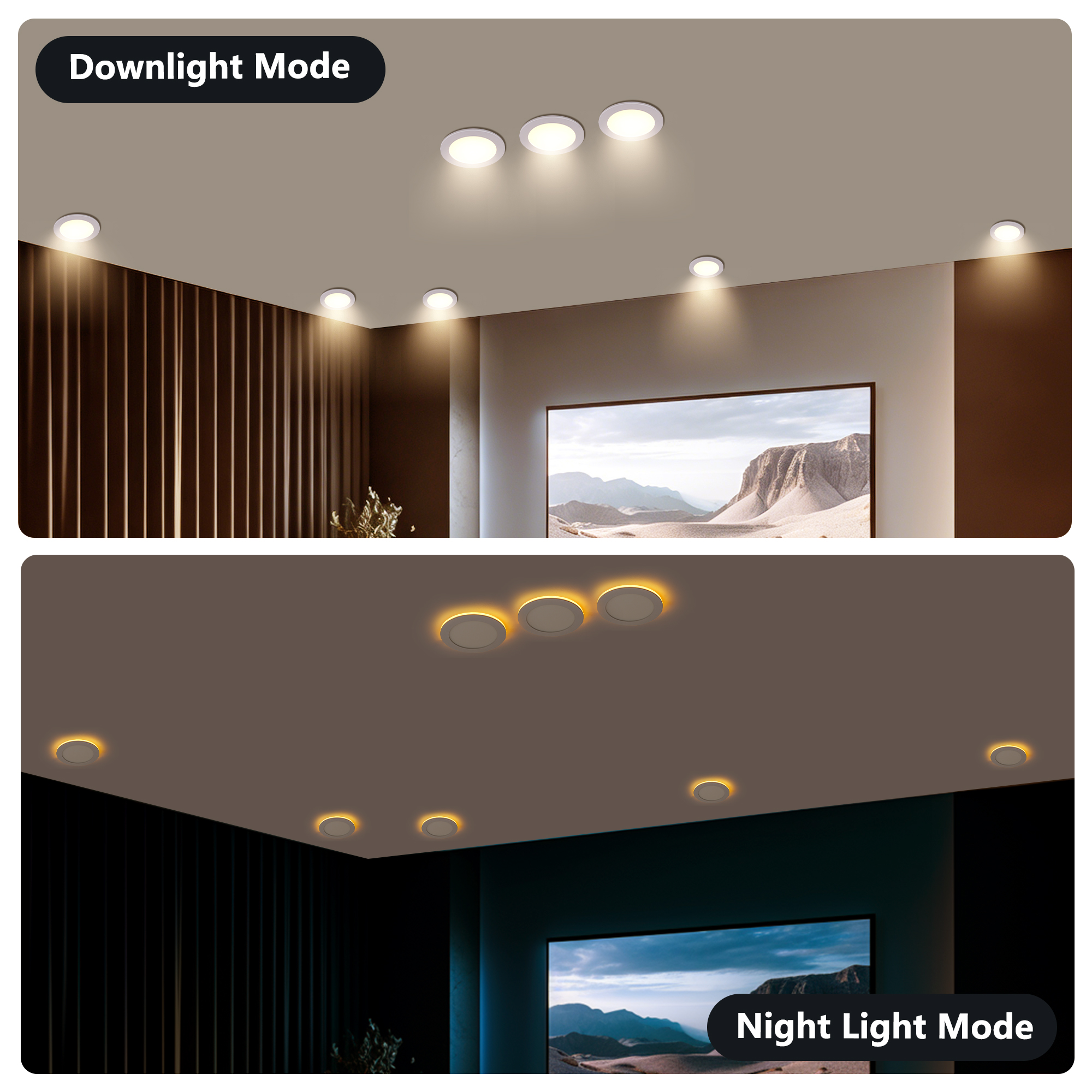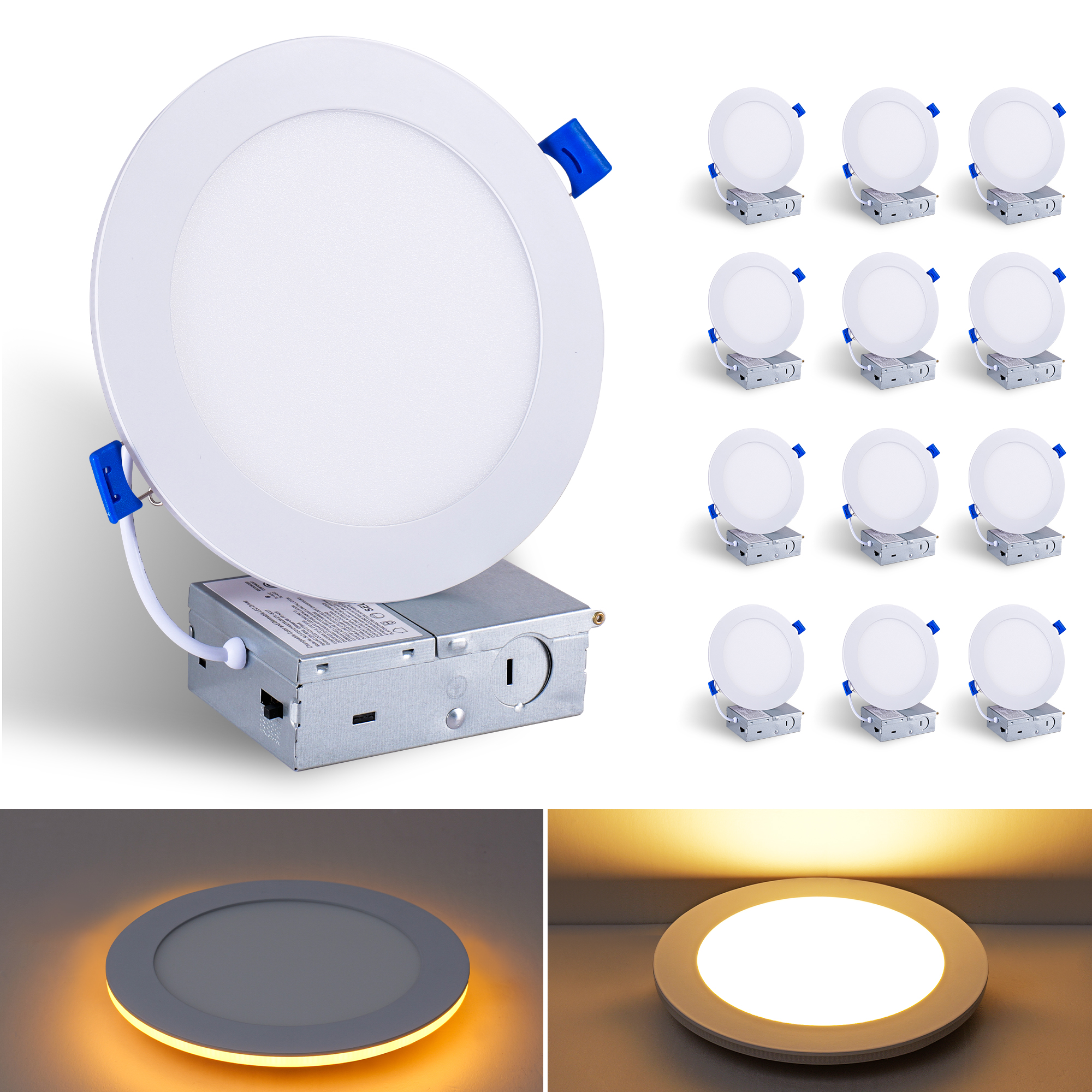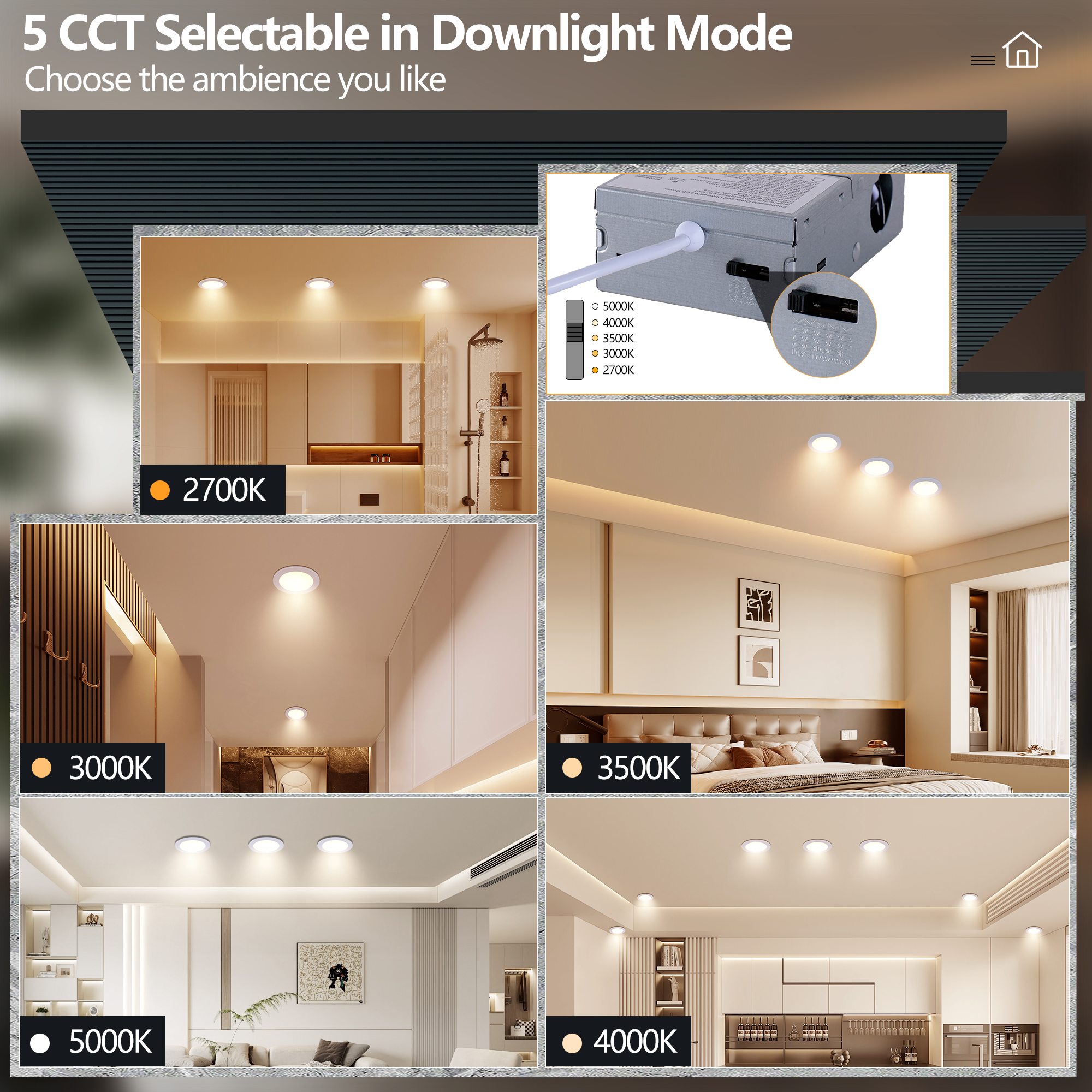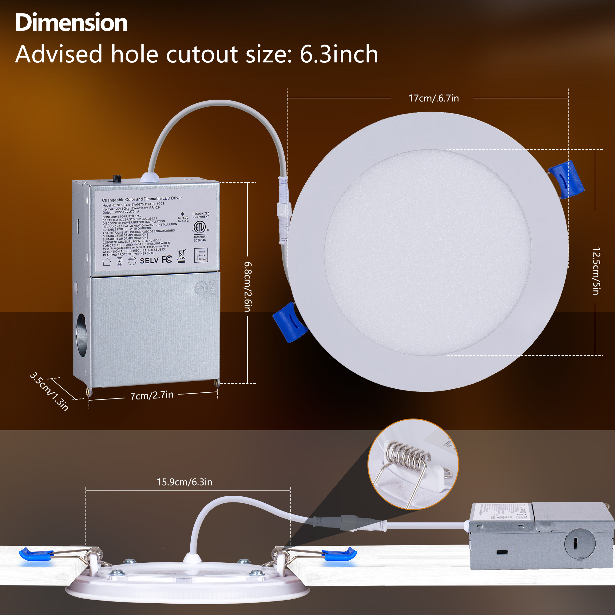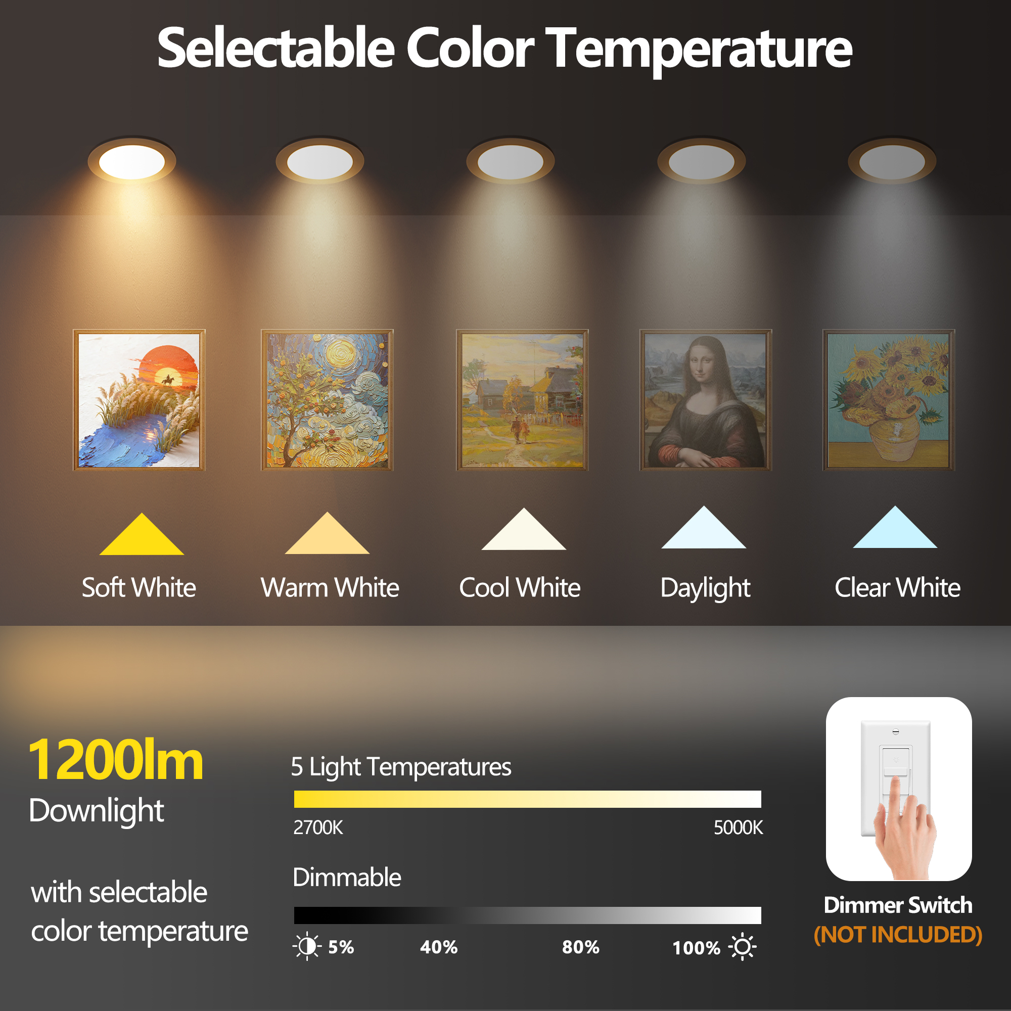 Choose from 2700K, 3000K, 3500K, 4000K, 5000K with a simple click on the side of the J-box.Recessed ceiling lights can seamlessly fit into your bedroom, living room, kitchen, bathroom, workplace and other rooms.5%-100% smooth dimming, compatible with most Lutron dimmers. 1200LM consumes 12 Watts. Enjoy up to 88% energy savings without compromising on brightness. The LED lens is frosted for anti-glare and scratch-resistant.(Dimmer no included)Upgrade your can light with ease! Simply follow three steps: cut a hole with the provided template, connect the light to the cable, and secure it with the spring clip. Recessed cans are no longer a barrier to your lighting choices.Thermally protected junction boxes meet strict safety standards for worry-free use in residential and commercial spaces.