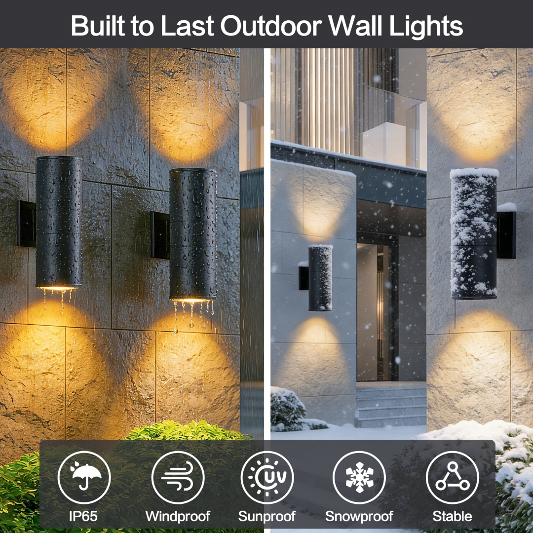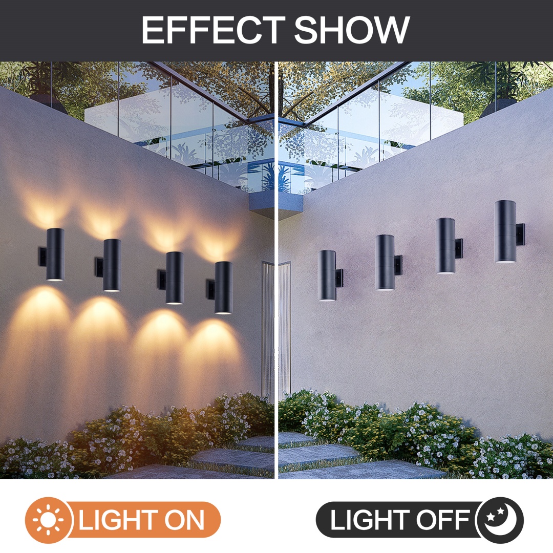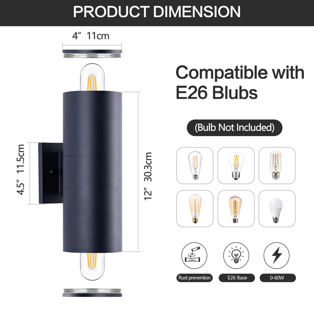 Up and Down Lighting Design - The outdoor light fixture features a unique top and bottom lighting design that provides ample light and creates a clean and modern look. Experience the perfect balance of style and functionality that complements any outdoor space.Built Tough for the Long Haul - Made with high quality aluminum material and tempered glass panels, these porch lights wall mount are weather-resistant and built to last. The matte black painted finish adds a sleek touch to your house, and the IP65 waterproof rating ensures the fixture can withstand rain, snow, and other harsh weather conditions.Modern Stylish - The up and down wall sconces are designed in a cylinder shape with clean lines and minimalist style for the modern home. The E26 bulb socket supports up to 60W maximum (bulb not included).Easy to Install - This outdoor wall sconce comes packaged with the required mounting accessories, the flush mounted design makes it easy to install, so you can install it in just 3 steps. The input voltage of 110-120V ensures that lights are compatible with most electrical systems.