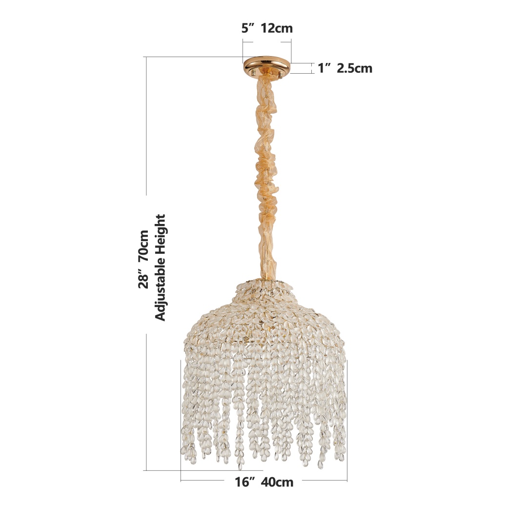 Stunning Waterfall Design: The cascading grape-shaped crystal bead string create a beautiful waterfall effect, adding a touch of elegance and luxury to any space.Luxurious Gold Finish: The gold-tone fixture complements the sparkling crystals, providing a sophisticated and vintage-inspired look that pairs perfectly with both contemporary and classic décor styles.High-Quality Crystal Beads: Made from durable, crystal-like beads that catch the light beautifully, creating a stunning visual display that enhances the charm of your space.Adjustable Hanging Length: The pendant light offers flexibility in installation, as it can be adjusted to different hanging heights, making it suitable for various ceiling heights and room sizes.Versatile Placement: This pendant light is ideal for a variety of spaces, including living rooms, bedrooms, entryways, or dining rooms, where it serves as both a functional light source and a striking decorative accent.