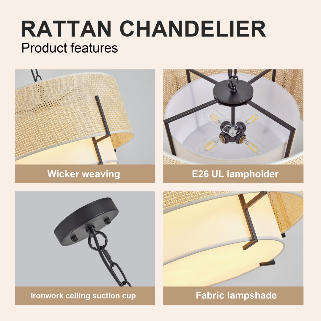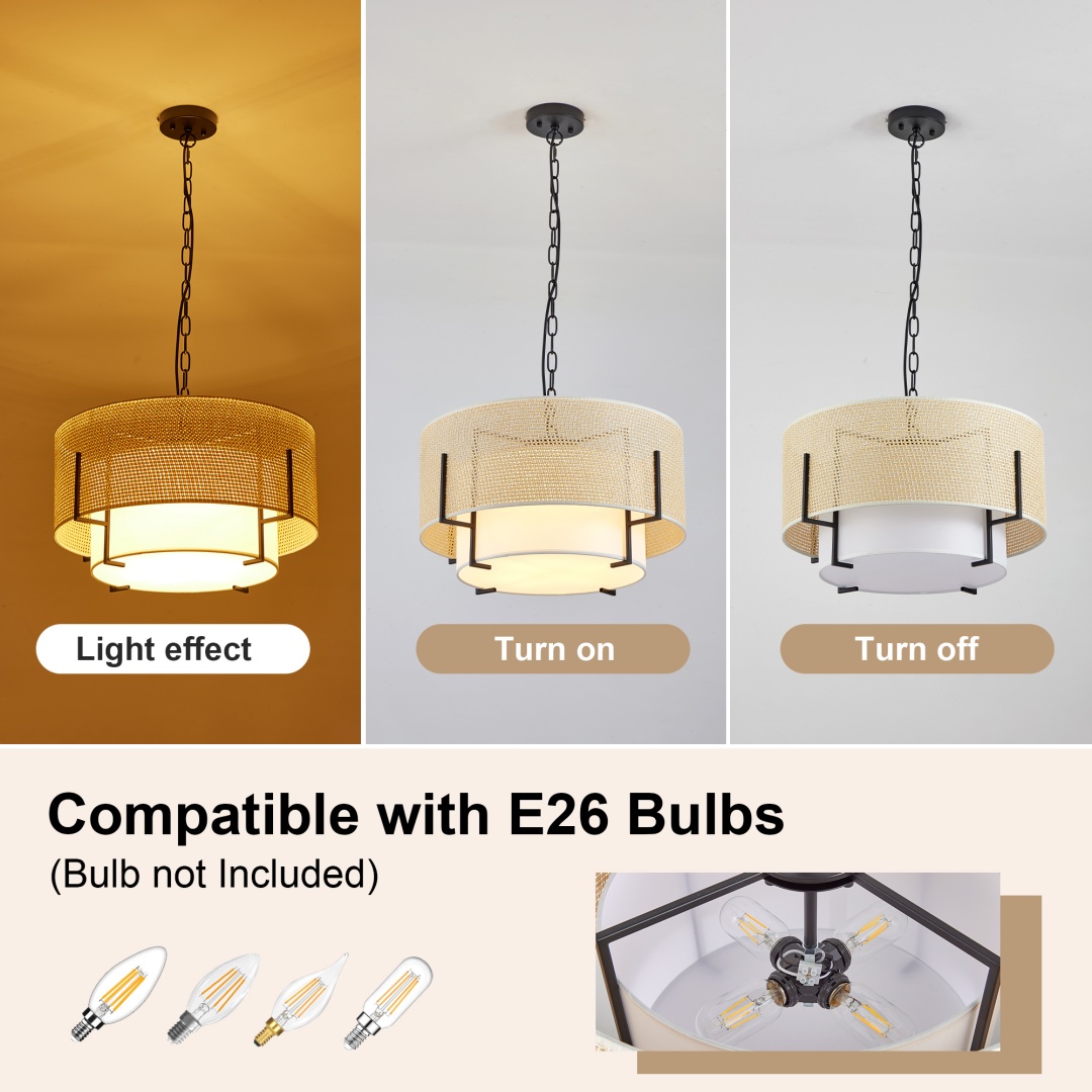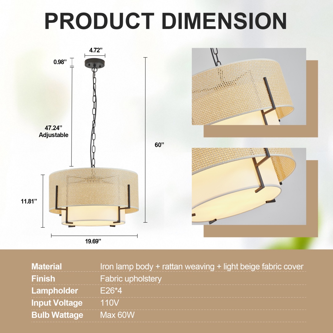 BOHO RATTAN CHANDELIER DESIGN: Elevate your home with this beautifully crafted rattan light fixtures that blends bohemian charm and farmhouse warmth. Its natural woven texture and soft fabric shade create a cozy, inviting atmosphere, perfect for modern rustic, boho, or eclectic decor.NATURAL HANDWOVEN BOHO CHANDELIER: Constructed with premium handwoven rattan, a linen-like fabric shade, and sturdy matte black metal hardware, this rattan chandelier adds organic texture, durability, and artisanal character to your space.WIDE APPLICATION: This farmhouse chandelier measures 19.7 inches in diameter.It fits perfectly in dining rooms, bedrooms, living rooms, entryways, foyers, kitchen islands, cafés, or restaurants. Easily adjust the height to suit your space and style.BULB REQUIREMENT: Requires 4 x E26 bulbs (max 60W each, not included). Compatible with LED, incandescent, compact fluorescent, and halogen bulbs (LED recommended). Fully dimmable with a compatible dimmer switch to create the perfect ambiance (dimmer sold separately).