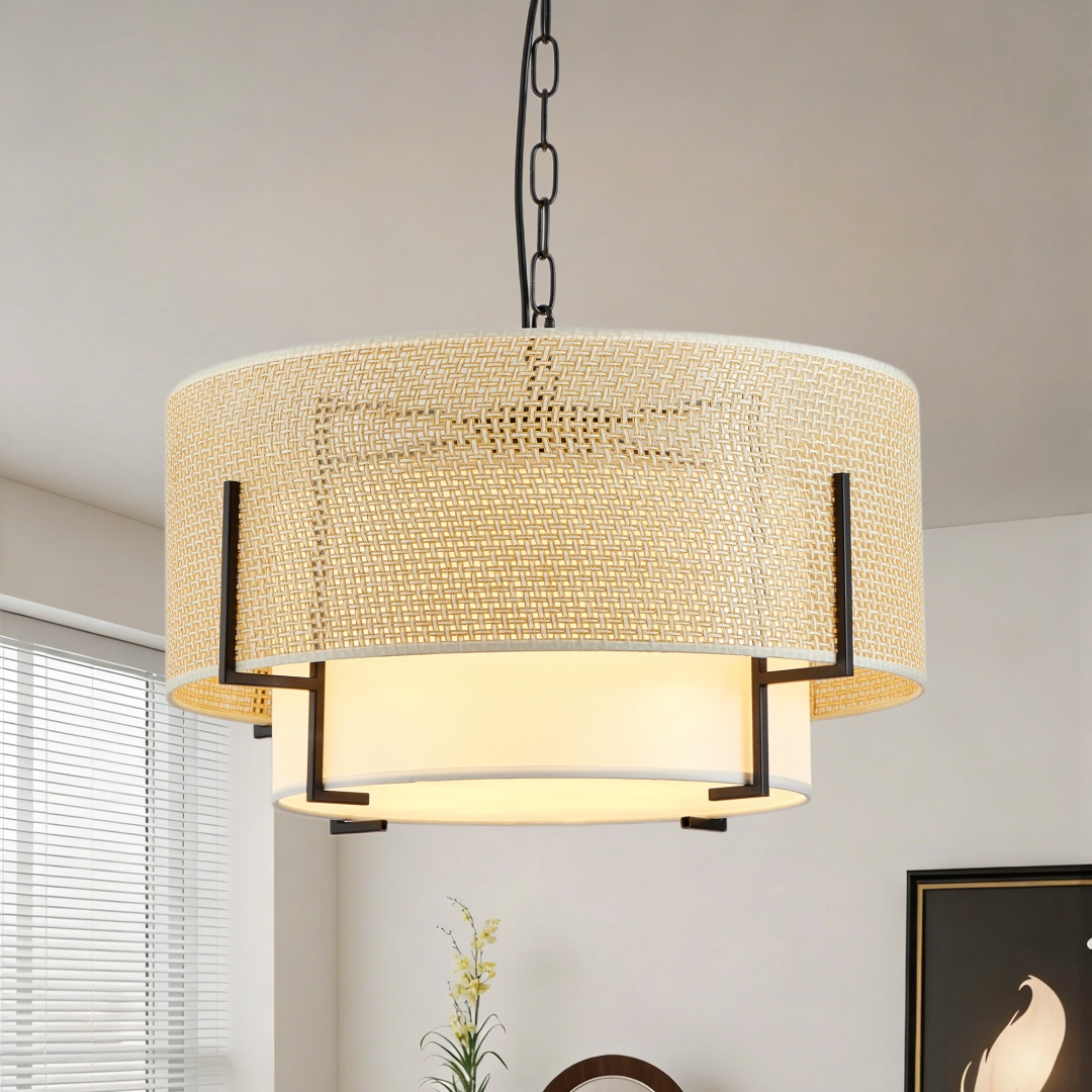 19.7in Farmhouse Boho Chandelier,4-Light Hand Woven Rattan Pendant Light With Fabric Shade Rustic Drum Chandelier For Dining Room Kitchen Bedroo