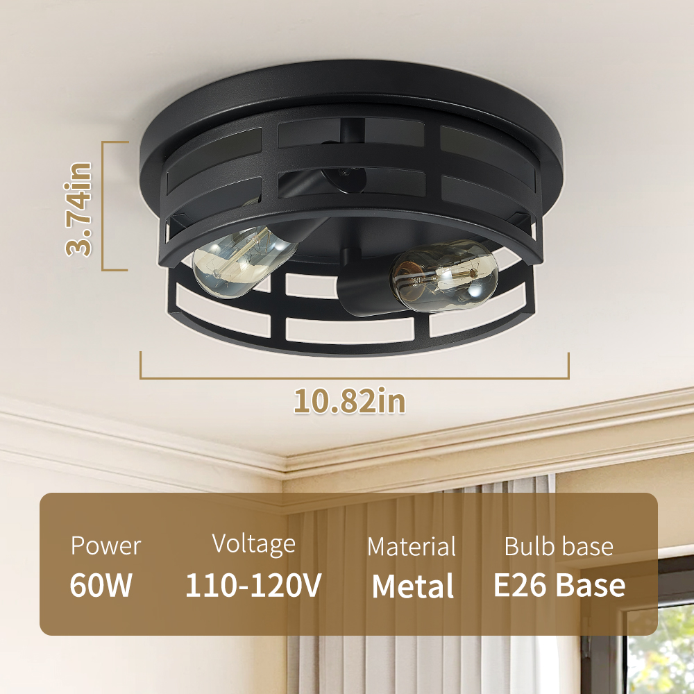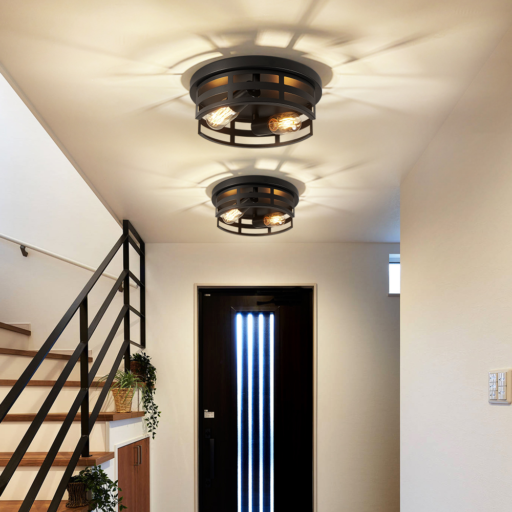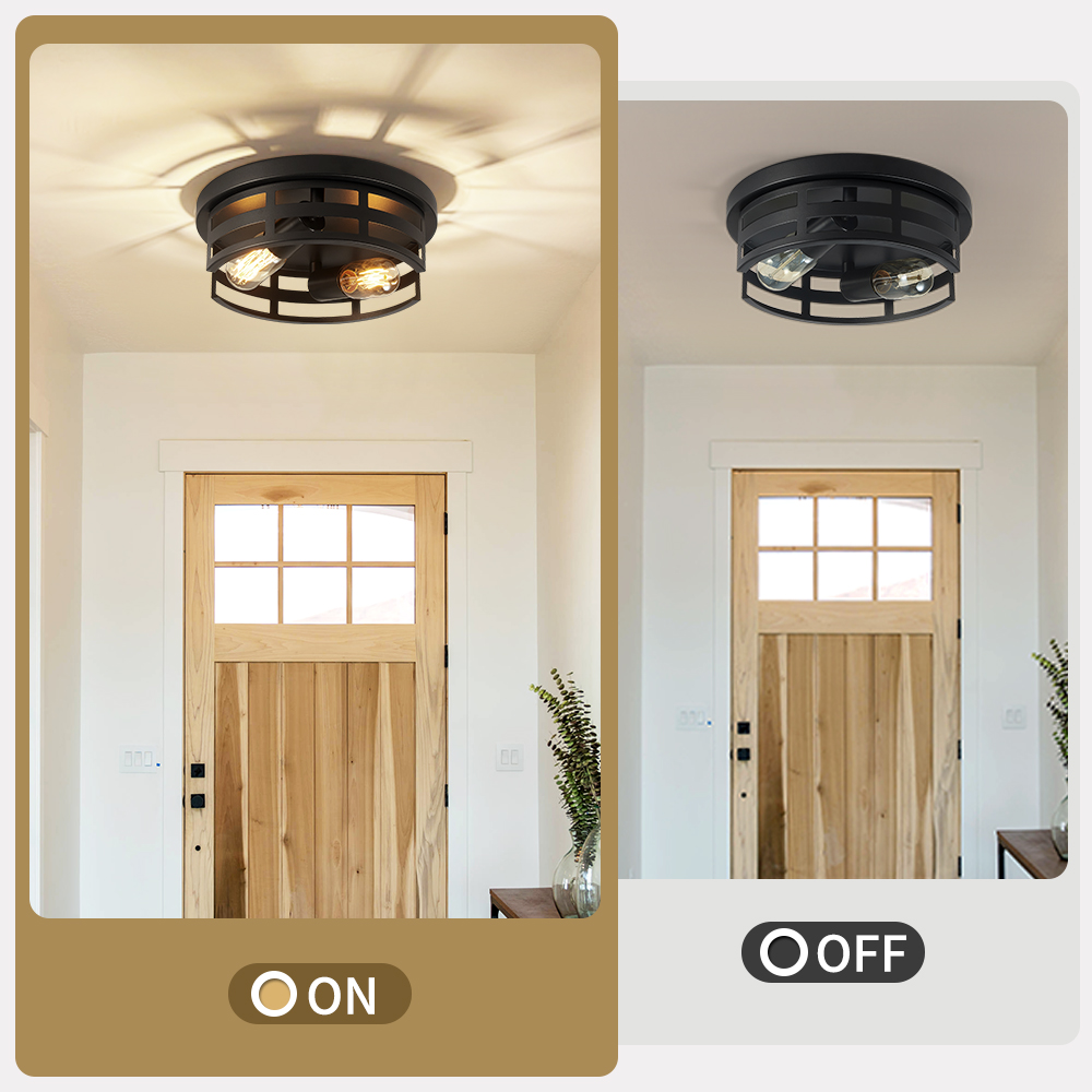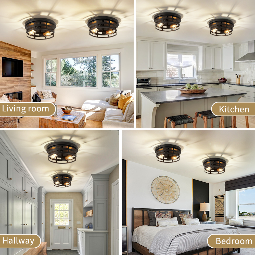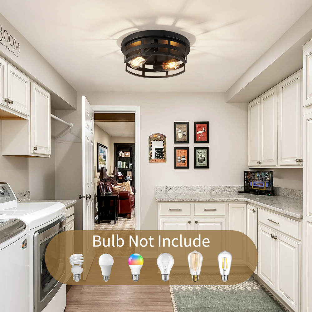 The Design You Like:.2-Llight flush mount ceiling light fixture with black finish and sturdy frame.Modern design add industrial sense to your farmhouse.We wish the light fixtures ceiling mount would not only be a ceiling light but also an art decorationThe Durable Material You Need:We adopot black finish,hallway light fixtures ceiling is not only antirust but also antidust.Importantly enough,we adopt the more durable and longer lifespan metal,our team consider the shopping experience of our customersWhich Bulbs is Suitable:This 2-Light black flush mount ceiling light support any E26 base bulb (MAX 60W each bulb).Such as LED/CFL/Halogen bulb or other any E26 base bulb. Our hallway light fixtures ceiling is also designed to be dimmable when used with a dimmable bulb.(Bulbs are not included)Easy to Install:Flush mount ceiling light fixture with clear guidance and installation video.If you are confuzed about how to install,you can contact us.