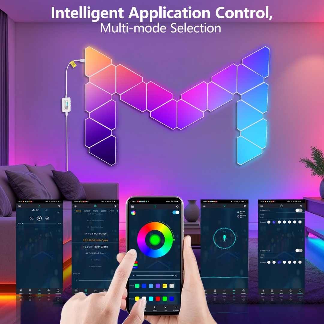 【Quality Assurance, Durable Materials】Made of high-strength ABS+PC composite for long-term use. Features professional soft light, glare-free illumination. Built with long-life LEDs offering 30,000+ hours of steady brightness.【Multi Smart Control-Immersive Music Sync】Built-in high-sensitivity mic supports real-time music sync. Lights instantly change colors and pulse to the beat of your music, games, or movies.【Premium Multi-Scenario LED Gift】Stunning dynamic triangle LED light made of high-quality ABS + PC material. Elegantly Packaged,easy to install and long-lasting, it's a cool birthday or holiday gift for boys, teens, men, and kids.【Easy Installation, Modular DIY Design】No drilling needed.Each panel comes with a strong adhesive pad for secure attachment to the wall, leaves no residue when removed. USB-powered for plug-and-play lighting, no wiring required.Suitable for all ages.
