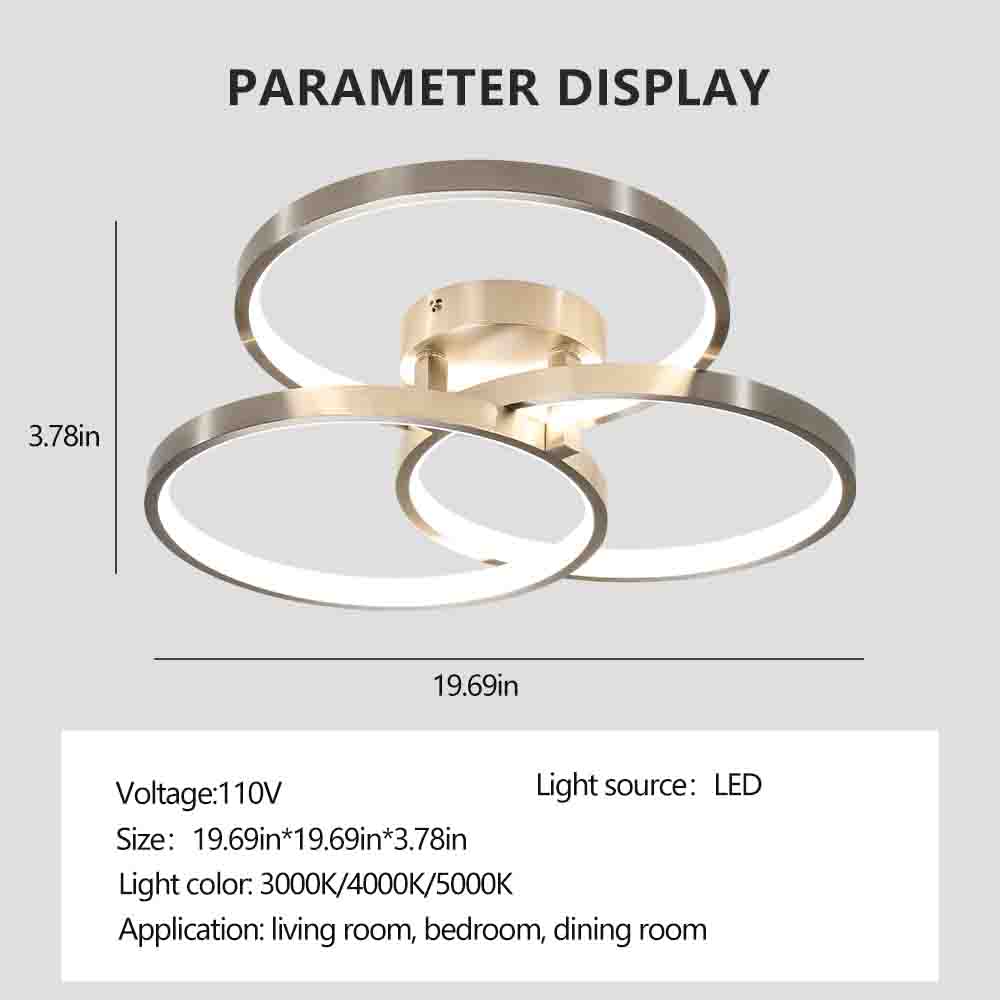 20in Modern LED Ceiling Light Fixture - Circular 3-Ring Design, Dimmable, Contemporary Brushed Nickel Finish For Living Room, Bedroom & Office