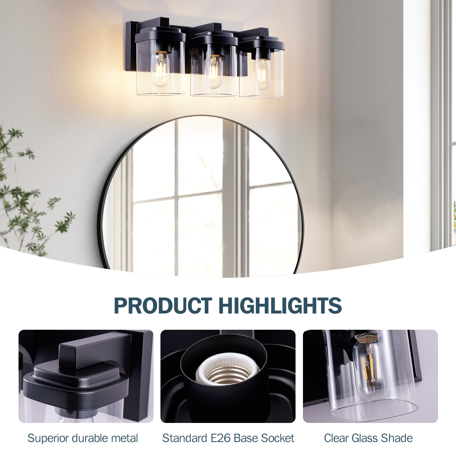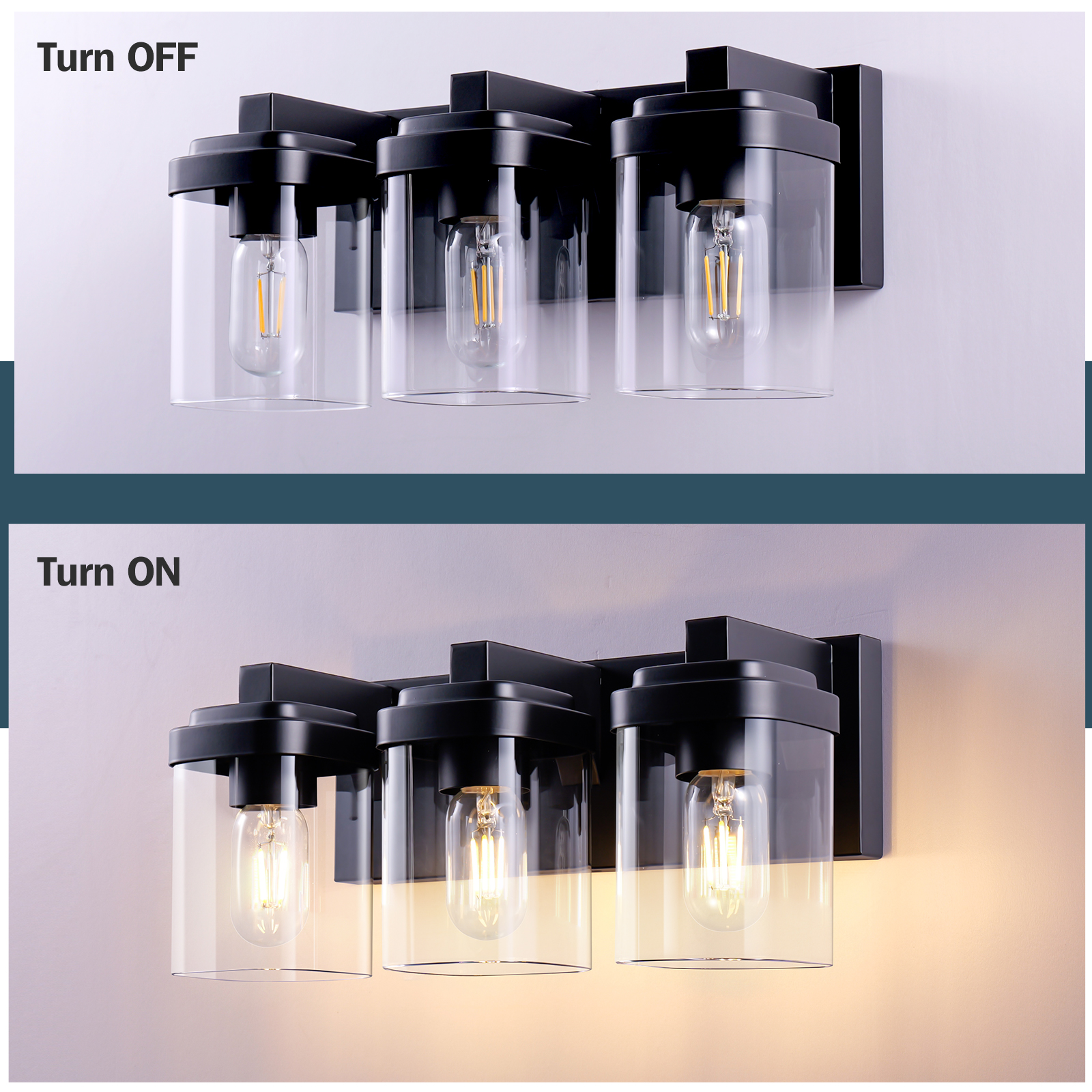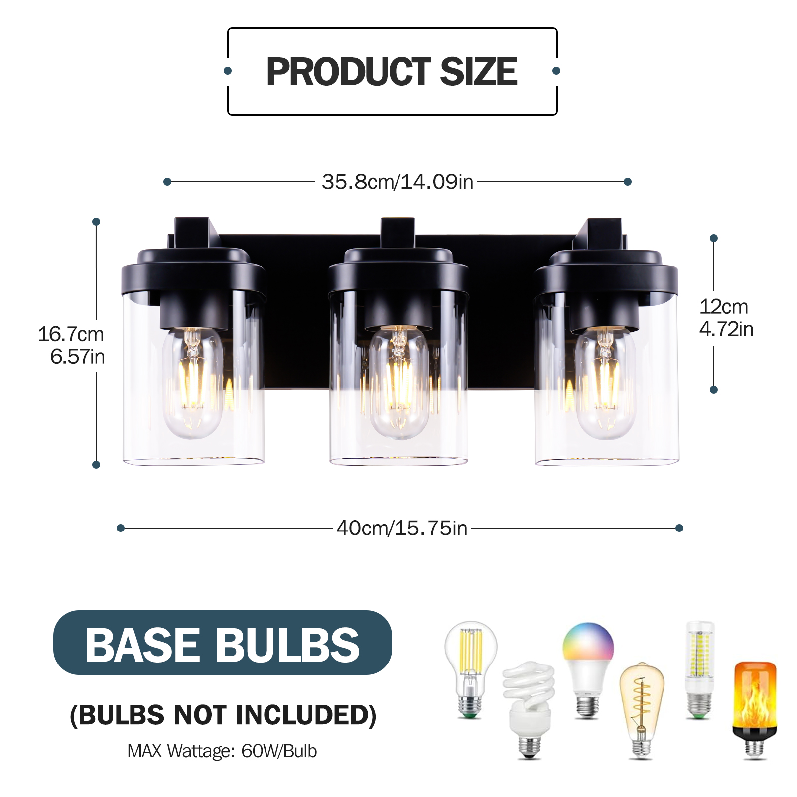 Sturdy Frame Construction & Extra Large Base Panels: This 3-light black bathroom vanity light is made of matte black finish frame, clear glass lampshade, and ceramic sockets. The metal surface adopts matte craft, no need to worry about oxidation and fading. The extended base can provide better stability for the lamp and can completely cover the size of the junction box, making the use of electricity safer.E26 Standard Sockets: Bathroom vanity lights size: 15.7''x 6.7''x6.6''. Bathroom Lighting Fixtures over mirror compatible with any E26 base bulb (Incandescent, CFL, halogen, LED bulbs suitable, Max 60W for each bulb). Vanity lights are fully dimmable when used with a dimmer bulb and switches(not included) so that you can choose different style bulbs and control the desired brightnessWide Application Range: Farmhouse bathroom light fixtures is designed in a refined and contemporary style on the wall when lighting to create a touch of brilliance in your residence.Perfect bath wall decor for bathroom over the mirror, vanity, closet, foyer, stairs, and art display. This bathroom wall lighting fixture comes with an open bottom, which allows you to change bulbs(E26 Base)easilyEasy Installation:vanity lighting fixtures are fully pre-wired. All mounting hardware required for installation is included in the package, just need to connect the wire and assemble the shade only. The entire installation process takes less than 10 minutes. The vanity Lighting Fixture can be mounted facing upward or downward to suit your needs. Have an excellent idea for your bathroom mirror or bedroom, living room, dressing table, vanity table, mirror cabinets, doorway, or entryway.
