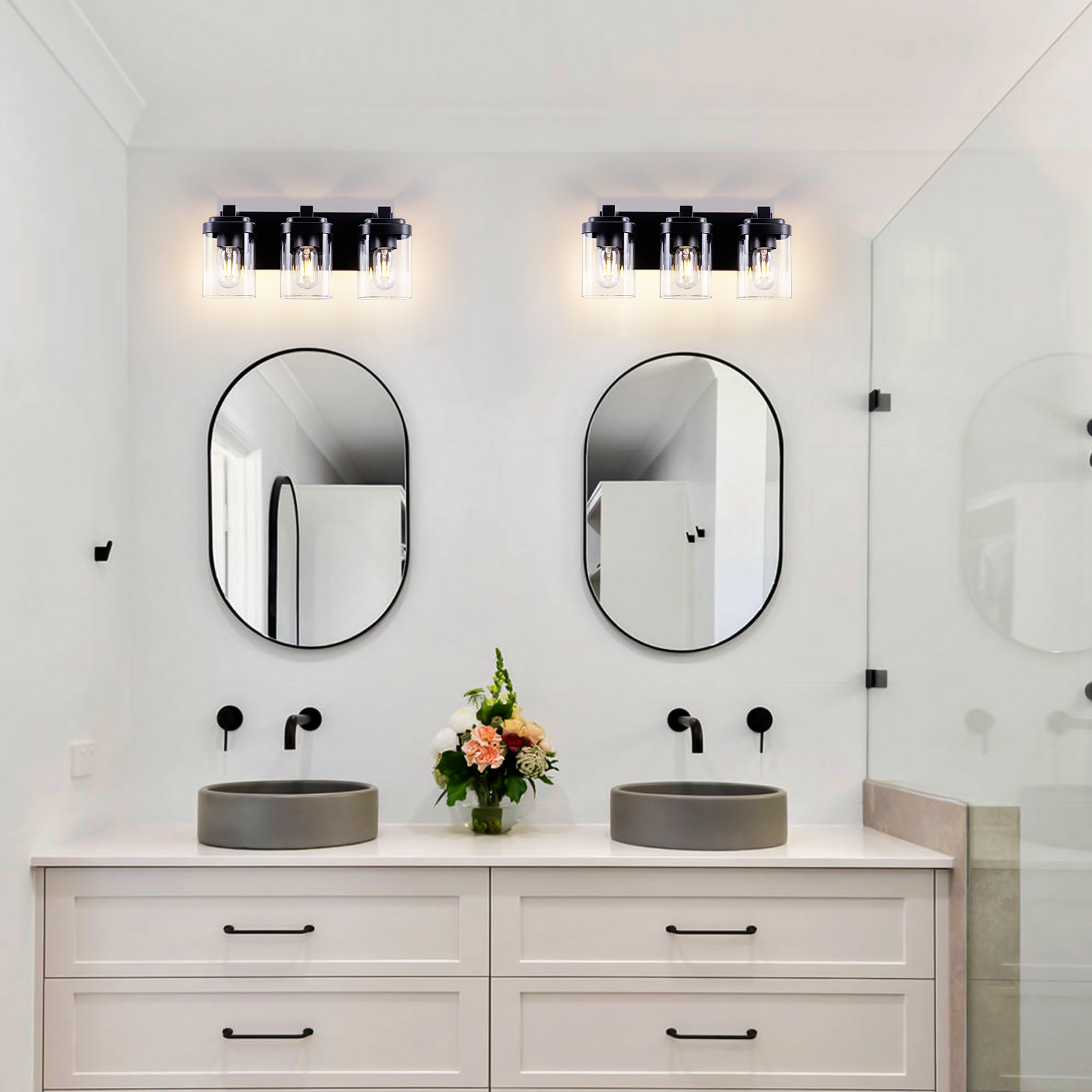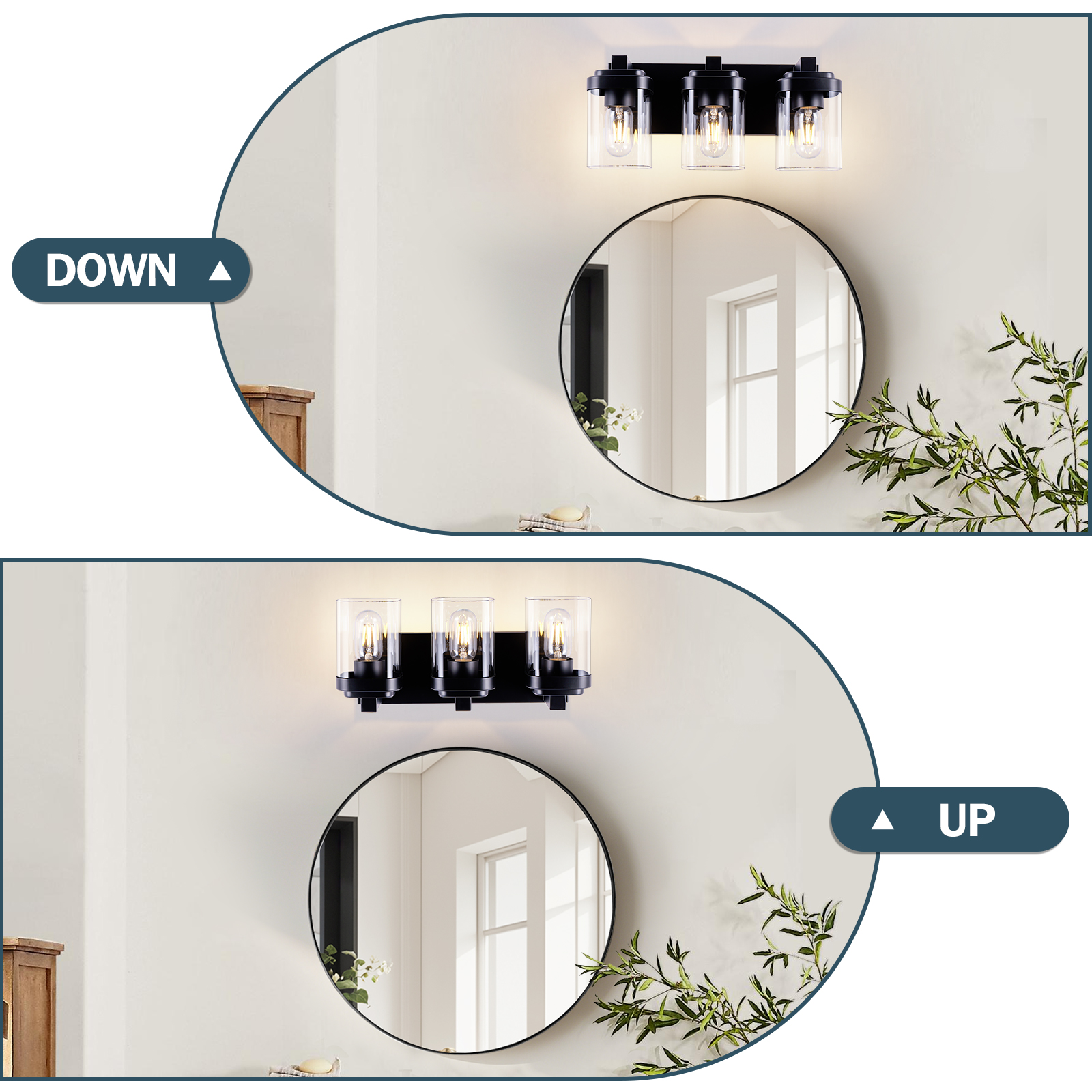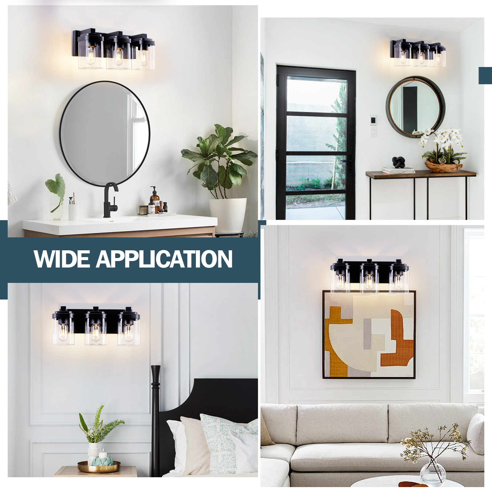 Sturdy Frame Construction & Extra Large Base Panels: This 3-light black bathroom vanity light is made of matte black finish frame, clear glass lampshade, and ceramic sockets. The metal surface adopts matte craft, no need to worry about oxidation and fading. The extended base can provide better stability for the lamp and can completely cover the size of the junction box, making the use of electricity safer.E26 Standard Sockets: Bathroom vanity lights size: 15.7''x 6.7''x6.6''. Bathroom Lighting Fixtures over mirror compatible with any E26 base bulb (Incandescent, CFL, halogen, LED bulbs suitable, Max 60W for each bulb). Vanity lights are fully dimmable when used with a dimmer bulb and switches(not included) so that you can choose different style bulbs and control the desired brightnessWide Application Range: Farmhouse bathroom light fixtures is designed in a refined and contemporary style on the wall when lighting to create a touch of brilliance in your residence.Perfect bath wall decor for bathroom over the mirror, vanity, closet, foyer, stairs, and art display. This bathroom wall lighting fixture comes with an open bottom, which allows you to change bulbs(E26 Base)easilyEasy Installation:vanity lighting fixtures are fully pre-wired. All mounting hardware required for installation is included in the package, just need to connect the wire and assemble the shade only. The entire installation process takes less than 10 minutes. The vanity Lighting Fixture can be mounted facing upward or downward to suit your needs. Have an excellent idea for your bathroom mirror or bedroom, living room, dressing table, vanity table, mirror cabinets, doorway, or entryway.