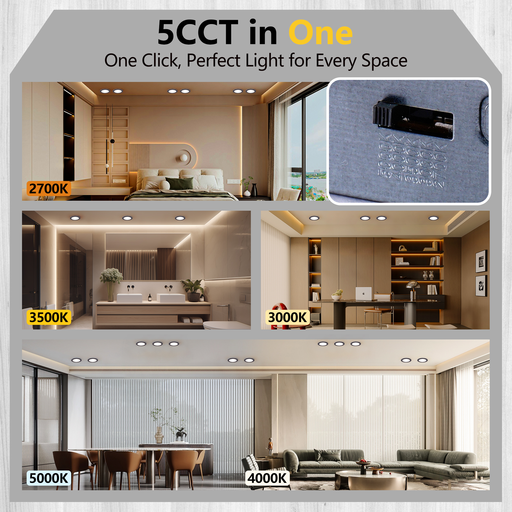 6 inch recessed lighting enjoy up to 90% energy savings without compromising on brightness. The enhanced LED chip emits 1200LM and consumes only 12 Watts. 5%-100% smooth dimming, compatible with most dimmers.(Dimmer no lincluded)Cut a hole with provided template, connect the wires to the box & light, and secure the wafer light with its sturdy spring clips. Upgrade your lighting with ease!Choose from 2700K, 3000K, 3500K, 4000K, 5000K with a simple click on the side of the J-box, Ensenior's canless recessed light 6 inch provides perfect lighting for your bedroom, living room, kitchen, bathroom, home office and other rooms.These 6 inch led recessed lights has night light mode, which emits 2000K amber light for very soft glare-free ambient illumination