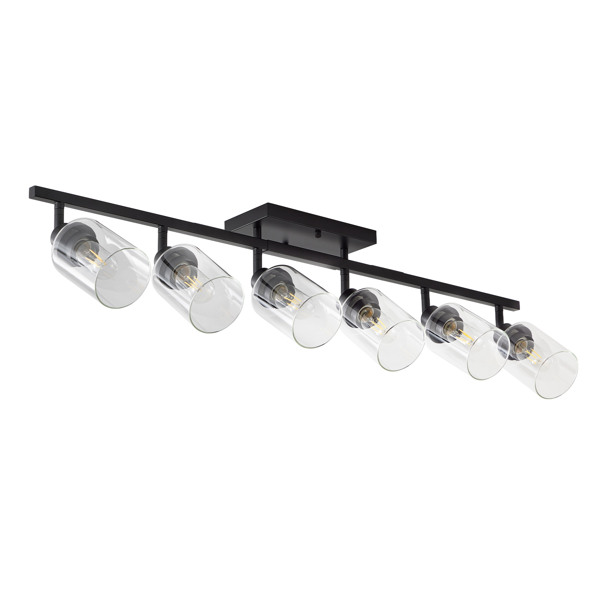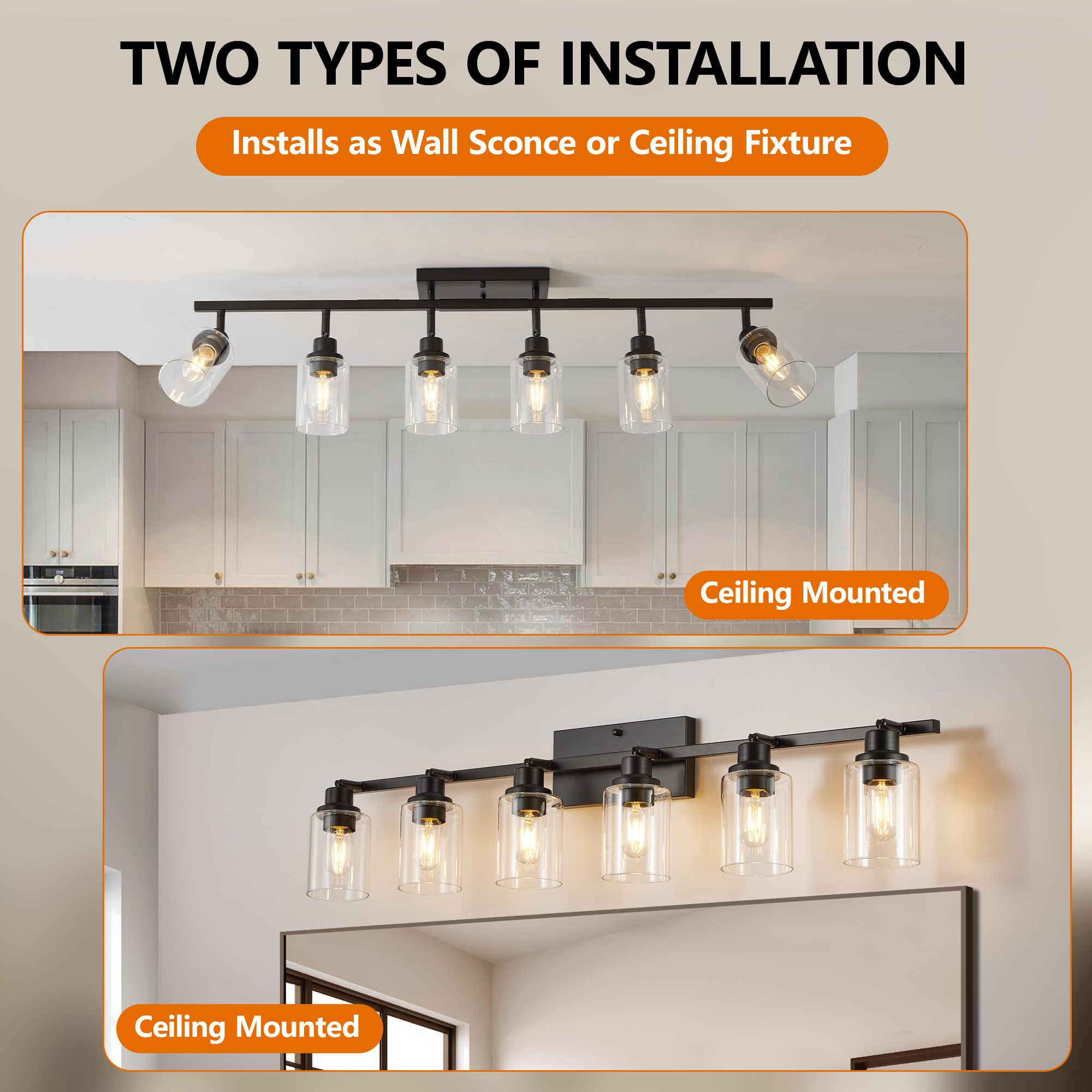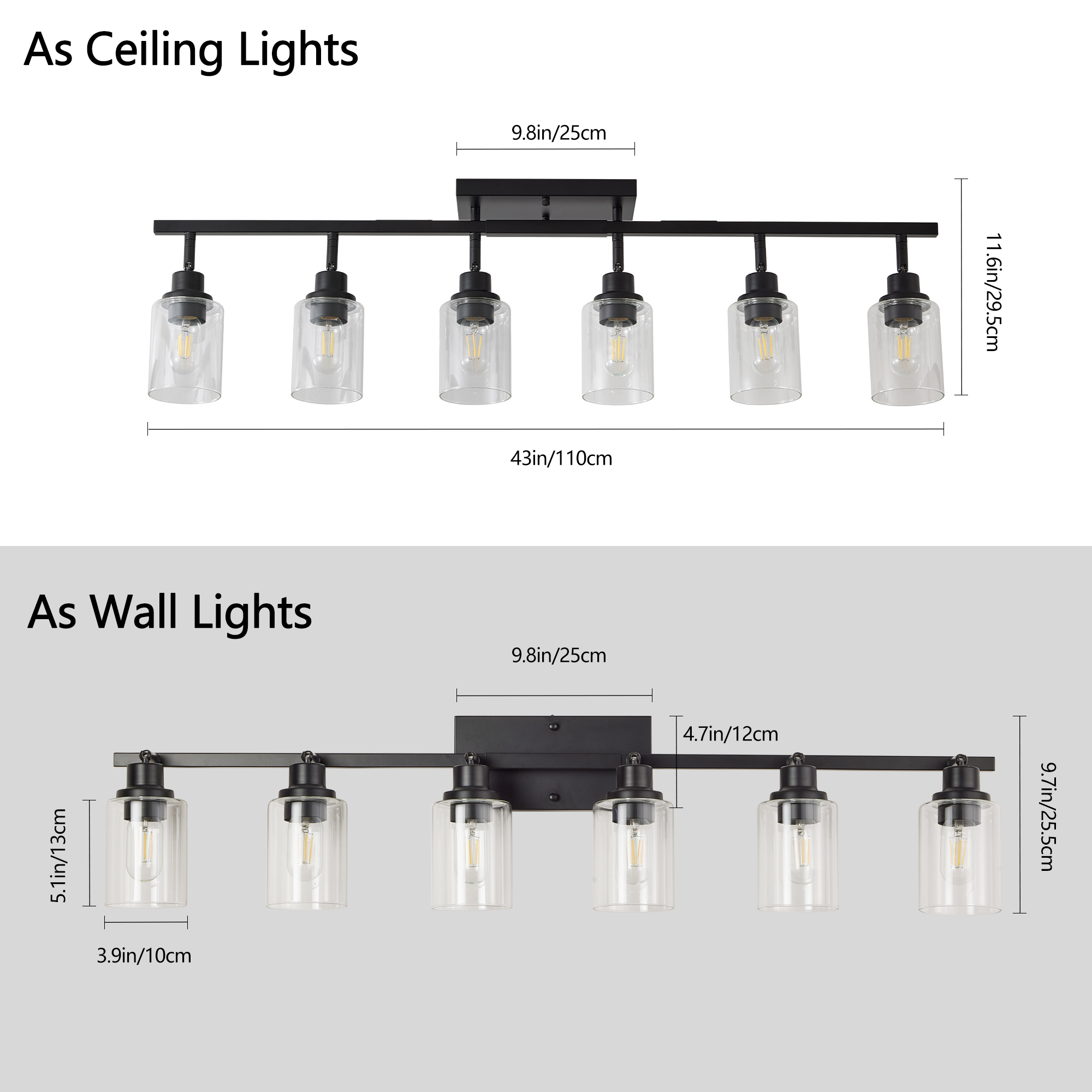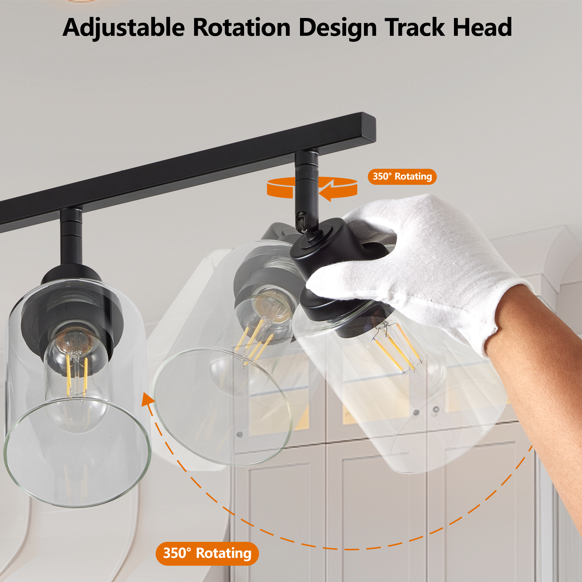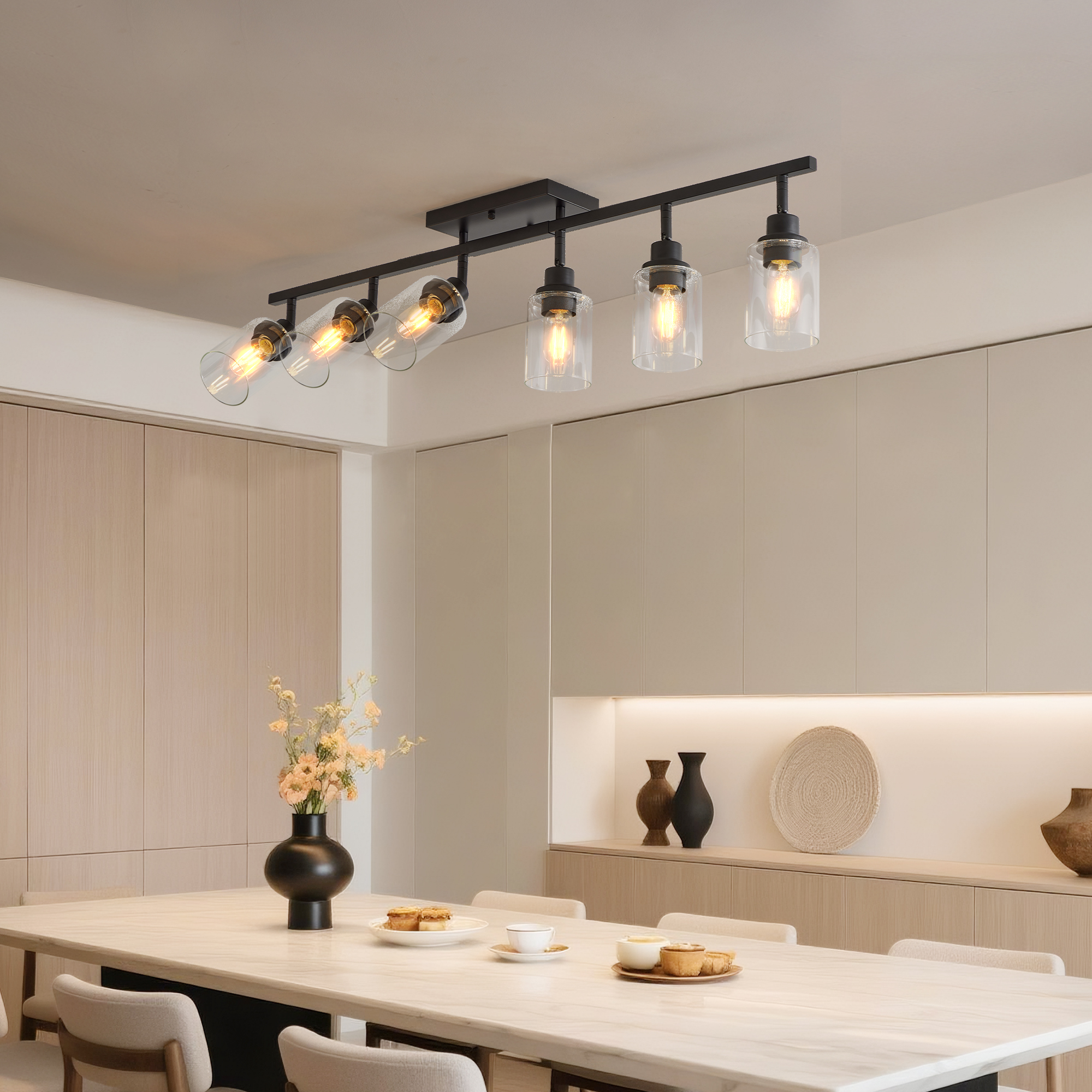 Modern Design: This 6-light track lighting kits features black finish and clear glass lampshade, simple and generous, not only conform to the trend of modern home decoration, but also elevating the overall beauty of your indoor spaceMulti Angle Lighting: The pivoting lighting head of the track lighting fixture can be 350 ° horizontal and 90 ° vertical adjusted, provide multi angle lighting to effectively focus the light, fully illuminate the indoor space layout you want to highlightE26 Bulb Type: The track light fixtures work with E26 socket bulbs, support edison, LED, CFL, Halogen, Incandescent light bulbs (Max 60W, Bulb Not Included). It's fully dimmable when used with dimmable bulbs and a compatible dimmer switchWide Applications: This ceiling track lighting is perfect for bathroom, kitchen island, bars, restaurants, cafes, clothing stores, retail shop windows, display racks, etc. provide comfortable lighting and create professional atmosphere