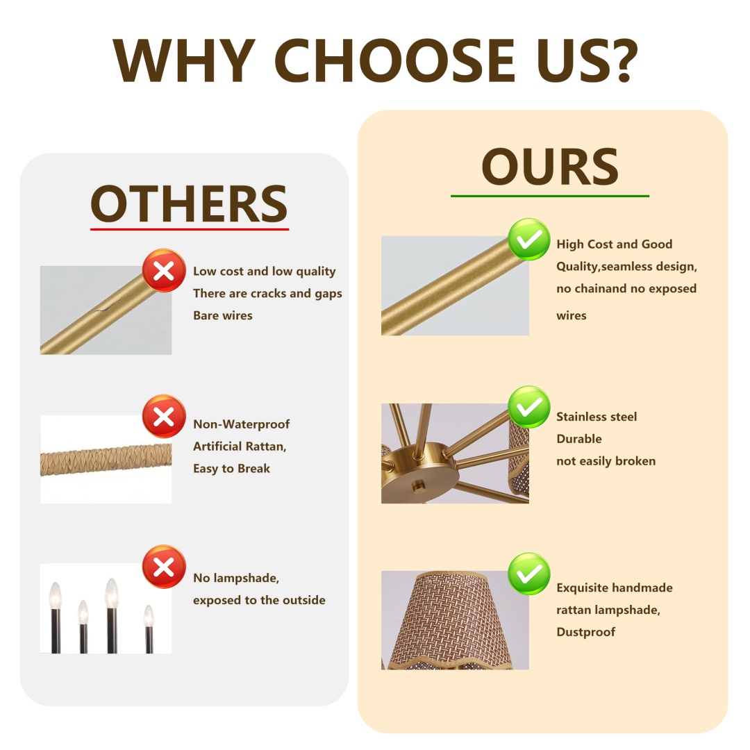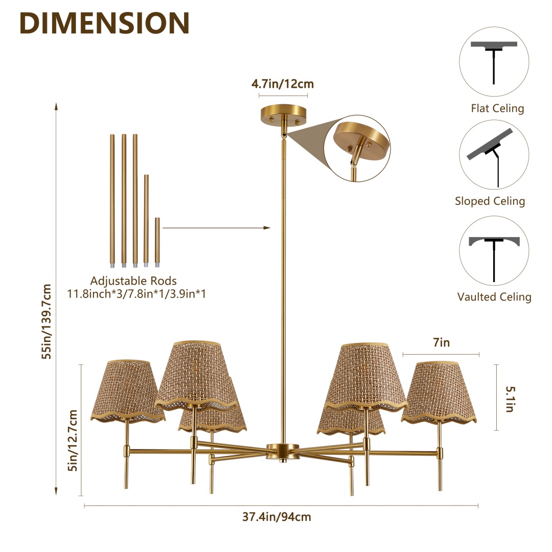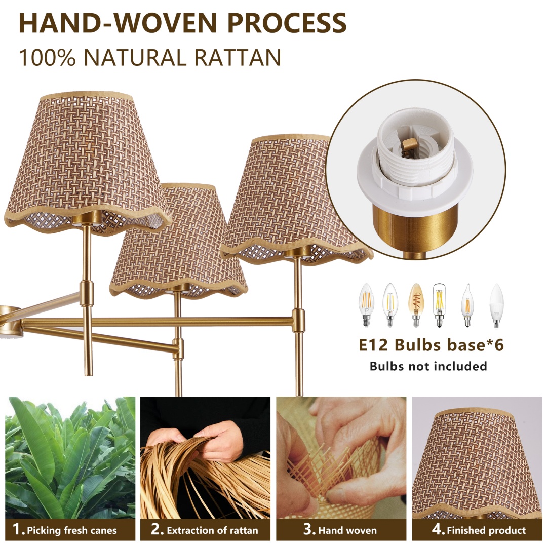 Handmade boho chandelier featuring real natural rattan ---- both shade and wrapped arms, no plastic/paper artificial rattan with yellow or brown color like others here; Features seamless brass-finished rod (no chains/exposed wires), nice brass (no green tint) and natural rattan color, and exquisite craftsmanship. Quality worth every penny—see the difference!Charming Design: This wagon wheel chandelier features a round shape adorned with six delightful mushroom-shaped flower shades, adding a cute and lively touch to your home while infusing a vibrant and fresh atmosphere.Hand-Woven Rattan: Unlike typical farmhouse chandeliers made of fabric, metal, or wood, this boho chandelier is crafted with rattan, hand-woven by skilled artisans. The rattan is intricately woven into both the shades and lamp arms, giving the chandelier a natural and unique appeal.E12 Dimmable Socket: This hand woven rattan chandelier accommodates 6 x E12 bulbs (40w max, bulbs not included); compatible with LED, incandescent, compact fluorescent, halogen bulbs, etc. It could be dimmable with compatible dimmable bulbs and switch; You could install with warm white, neutral white or cool white bulbs as you like;