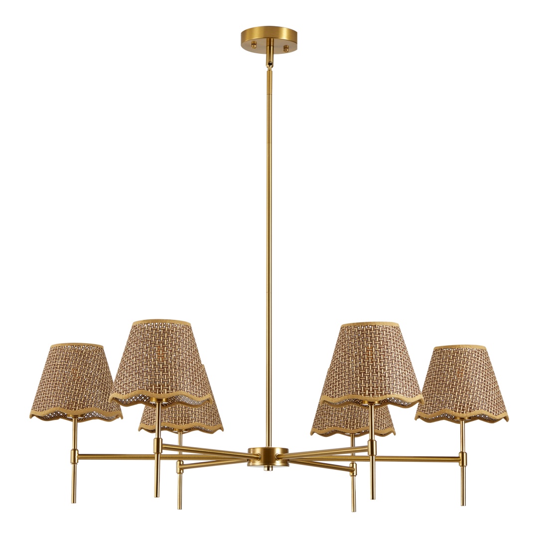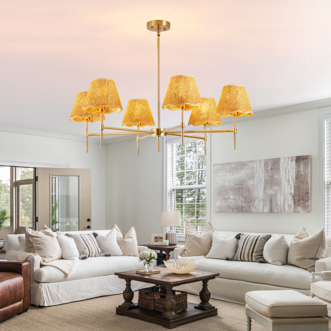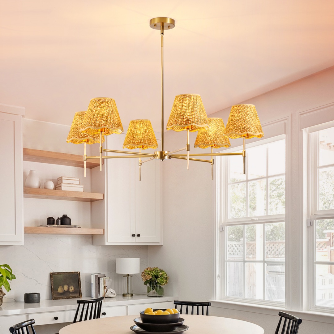 Handmade boho chandelier featuring real natural rattan ---- both shade and wrapped arms, no plastic/paper artificial rattan with yellow or brown color like others here; Features seamless brass-finished rod (no chains/exposed wires), nice brass (no green tint) and natural rattan color, and exquisite craftsmanship. Quality worth every penny—see the difference!Charming Design: This wagon wheel chandelier features a round shape adorned with six delightful mushroom-shaped flower shades, adding a cute and lively touch to your home while infusing a vibrant and fresh atmosphere.Hand-Woven Rattan: Unlike typical farmhouse chandeliers made of fabric, metal, or wood, this boho chandelier is crafted with rattan, hand-woven by skilled artisans. The rattan is intricately woven into both the shades and lamp arms, giving the chandelier a natural and unique appeal.E12 Dimmable Socket: This hand woven rattan chandelier accommodates 6 x E12 bulbs (40w max, bulbs not included); compatible with LED, incandescent, compact fluorescent, halogen bulbs, etc. It could be dimmable with compatible dimmable bulbs and switch; You could install with warm white, neutral white or cool white bulbs as you like;
