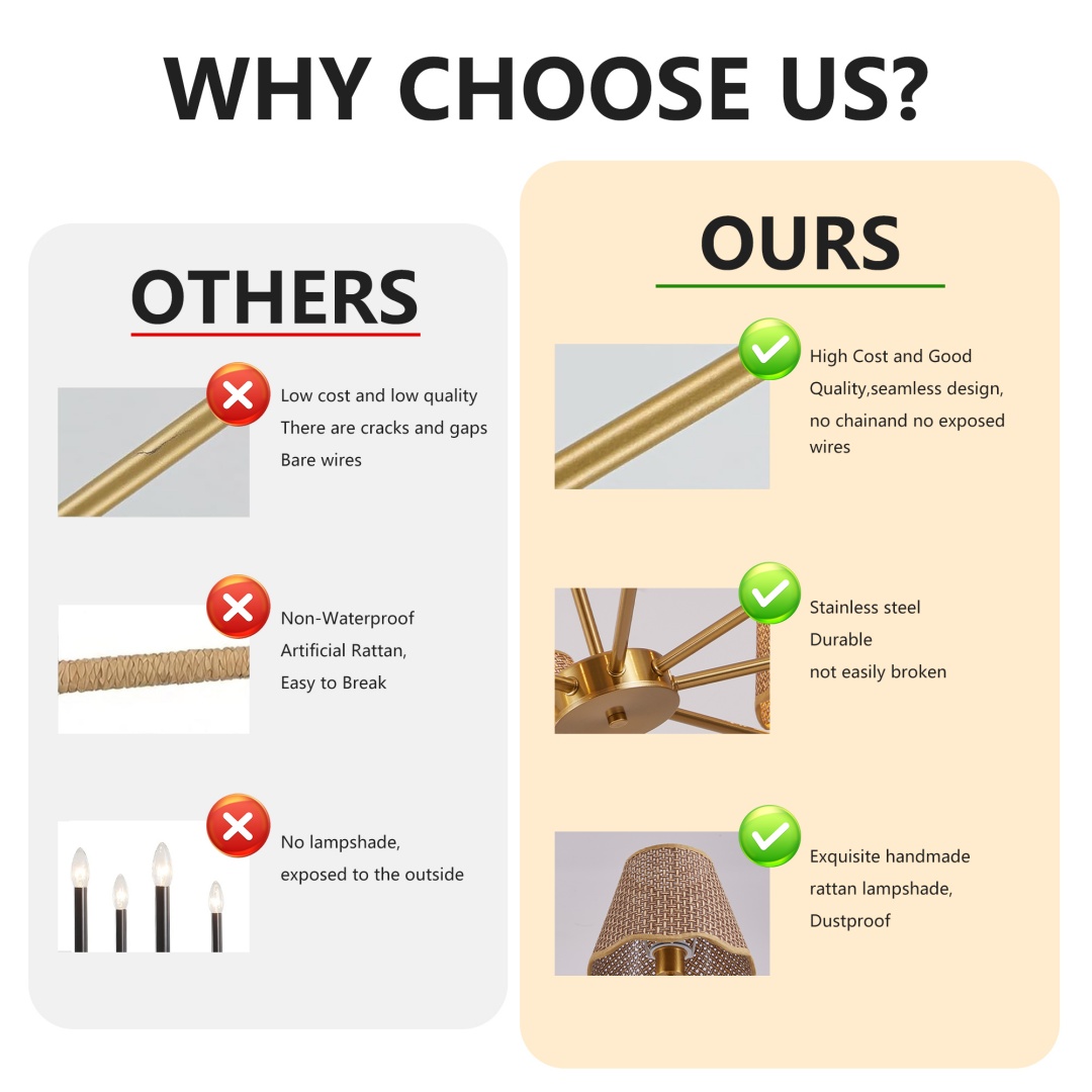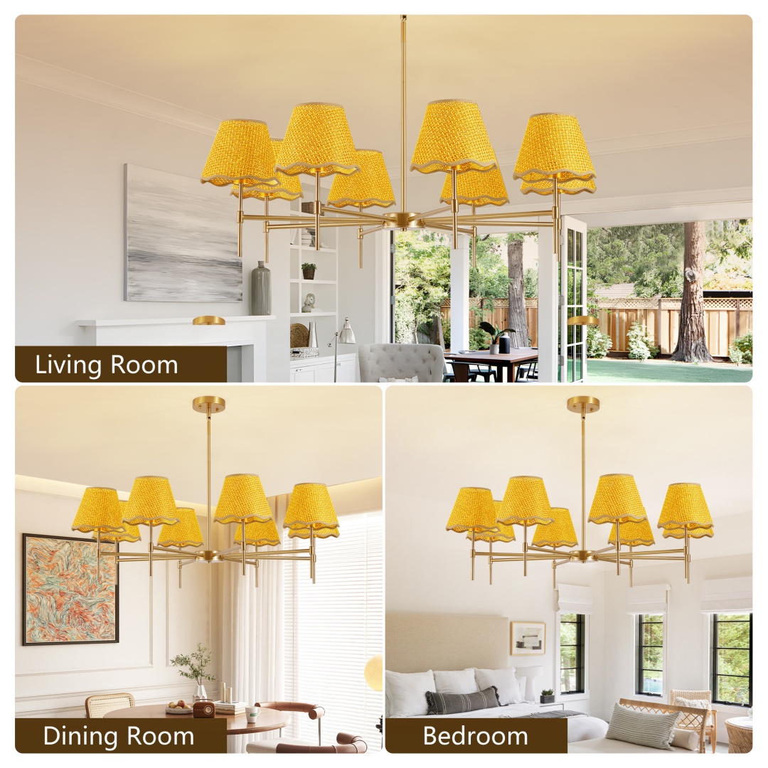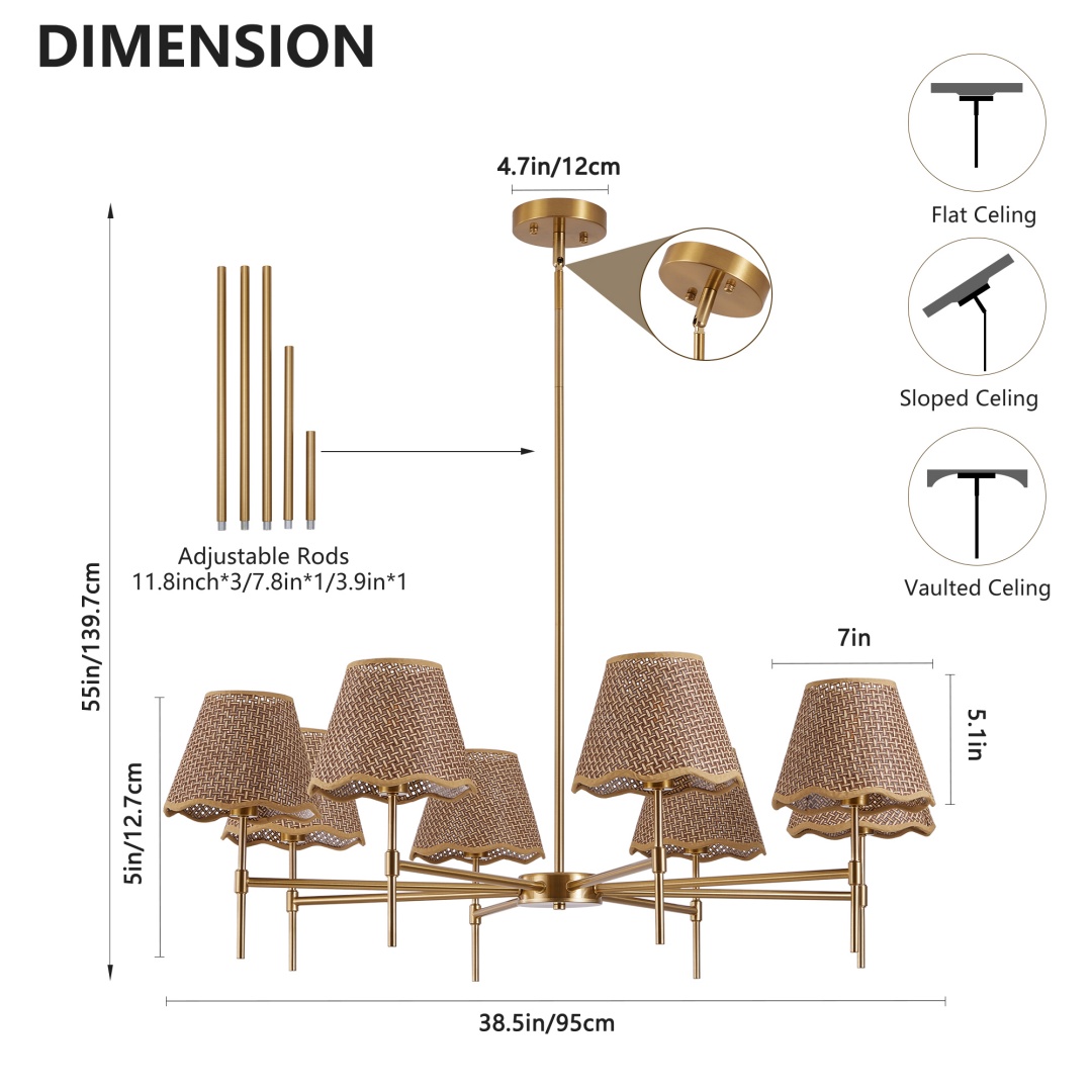 【38.6'' 】Crafted with natural hand-woven rattan shades, adds an artisanal touch, bring home warmth and style of Bohemian design! Sleek gold painted metal chandelier arms, blends boho charm with modern elegance, instantly elevating your home décor.【 & 】Boho rattan chandelier features US standard E12 base, ensure compatible with most E12 bulbs like LED, Incandescent, Halogen, RGB.(40W Max/Each Bulb). Chandelier also designed to work with a dimmer. Choose different light bulbs or use dimmer to customize your space’s atmosphere with ease, all while enjoying chandelier’s bohemian chic aesthetic. (Bulbs & Dimmer Not Included).【 】 You can freely combine these rods based on your space requirements to customize lighting height. Whether ceiling is low and you need a shorter drop, or you have a high - ceilinged room and want to make a grander statement, this chandelier adapts effortlessly.【 - 】Vintage 8-light design fits most indoor room types effortlessly, living room, dining room, bedroom, hallways, entryway, staircase, corridors, and kitchen. Install it in different spaces to unify your home’s look while meeting lighting needs. This rattan chandelier is a versatile gem for your home!