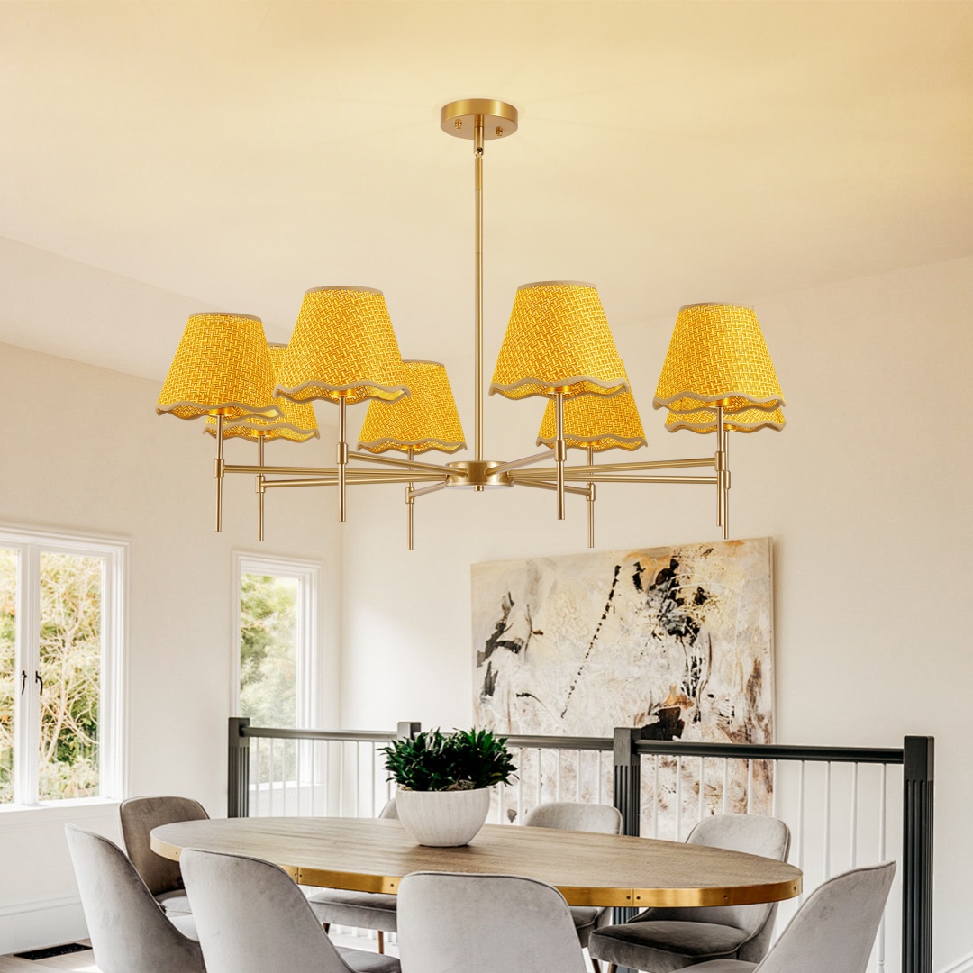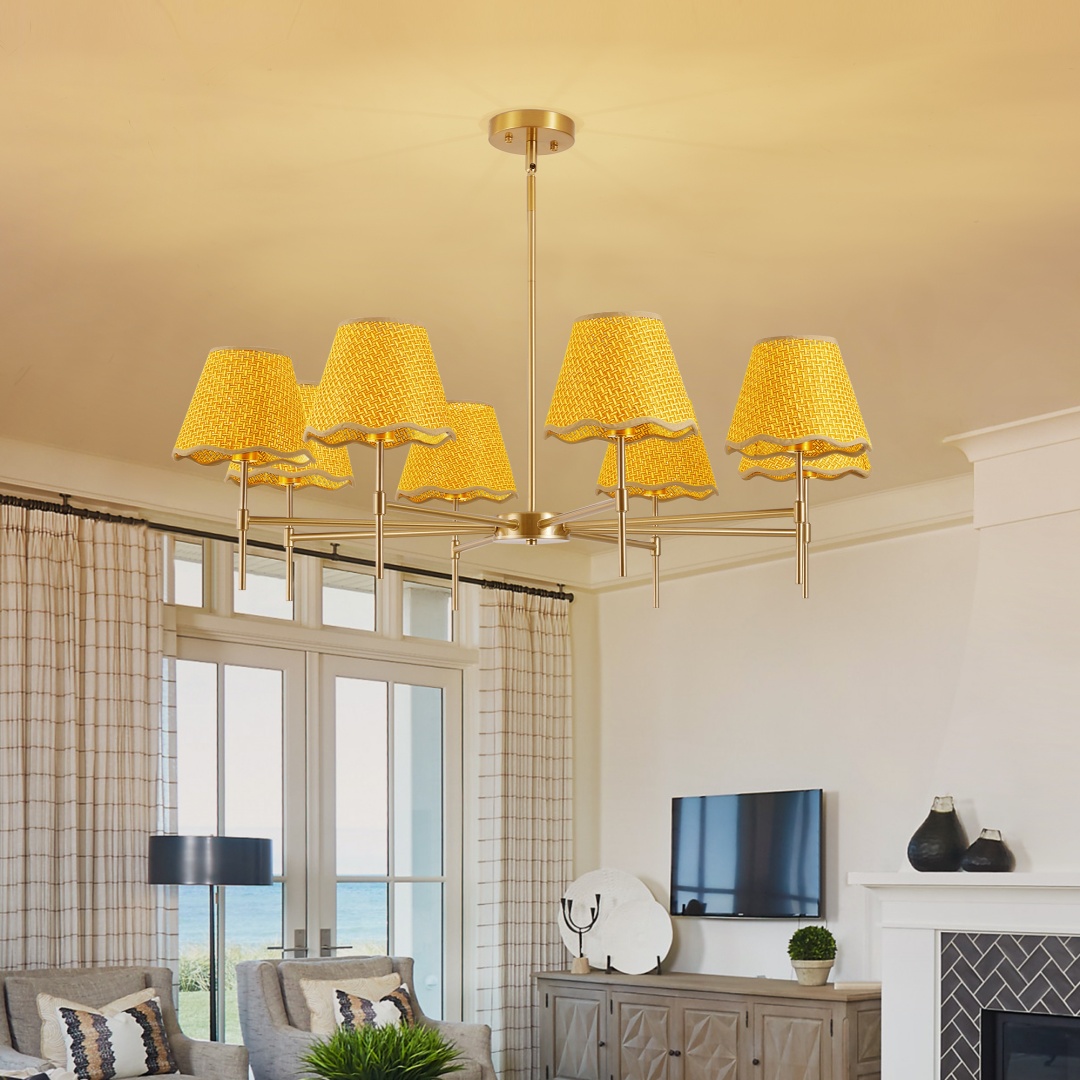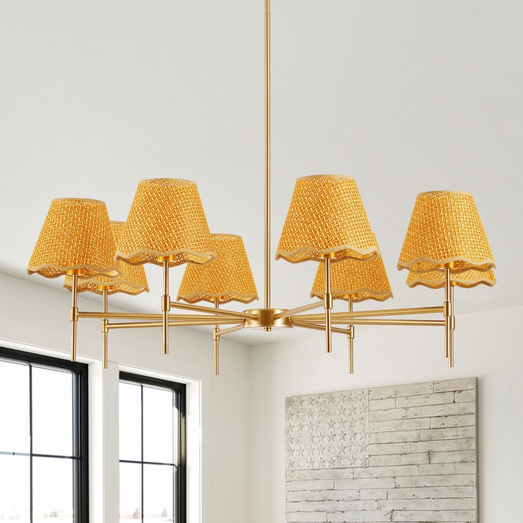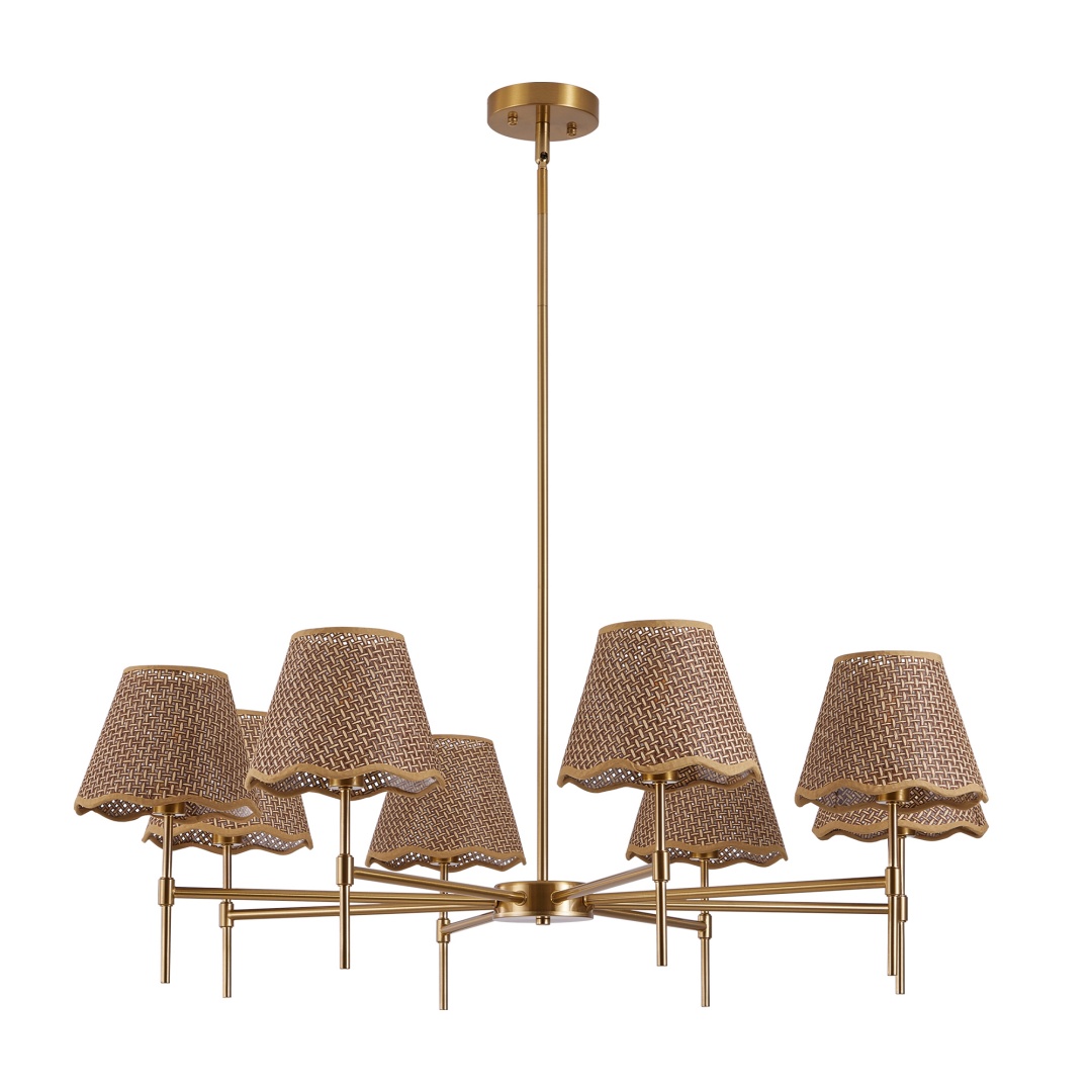 【38.6'' 】Crafted with natural hand-woven rattan shades, adds an artisanal touch, bring home warmth and style of Bohemian design! Sleek gold painted metal chandelier arms, blends boho charm with modern elegance, instantly elevating your home décor.【 & 】Boho rattan chandelier features US standard E12 base, ensure compatible with most E12 bulbs like LED, Incandescent, Halogen, RGB.(40W Max/Each Bulb). Chandelier also designed to work with a dimmer. Choose different light bulbs or use dimmer to customize your space’s atmosphere with ease, all while enjoying chandelier’s bohemian chic aesthetic. (Bulbs & Dimmer Not Included).【 】 You can freely combine these rods based on your space requirements to customize lighting height. Whether ceiling is low and you need a shorter drop, or you have a high - ceilinged room and want to make a grander statement, this chandelier adapts effortlessly.【 - 】Vintage 8-light design fits most indoor room types effortlessly, living room, dining room, bedroom, hallways, entryway, staircase, corridors, and kitchen. Install it in different spaces to unify your home’s look while meeting lighting needs. This rattan chandelier is a versatile gem for your home!