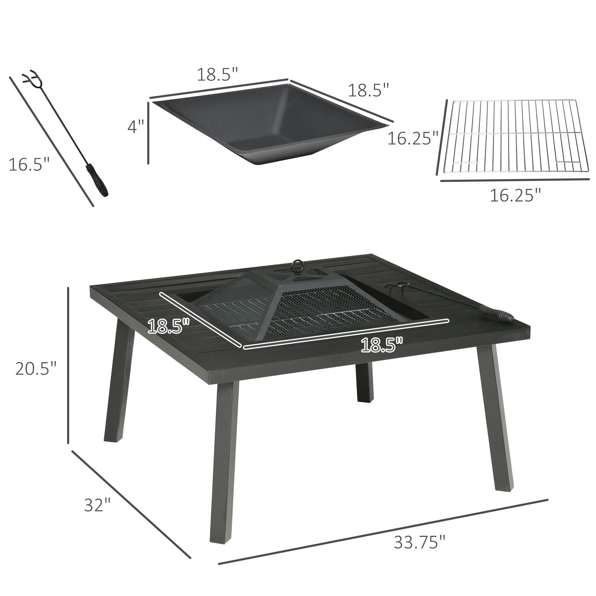 5.- Wood Burning Fire Pit with Grill Grate Info: Overall Size: 33.75" L x 32" W x 20.5" H. Internal Size: 18.5" L x 18.5" W x 4" H. Cover Size: 17.25" L x 17.25" W x 4" H. Grill Mesh Size: 16.25" L x 16.25" W. Poker Size: 16.5" L x 1.5" W. Waterproof cover included. Assembly required..