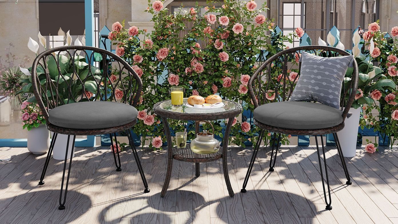 [Comfortable and Durable]: Crafted with an iron frame and reinforced anti-rust technology, this set withstands harsh weather. The premium PE rattan features a smooth surface, offering flexibility, breathability, and lasting comfort—perfect for long-term outdoor use.
