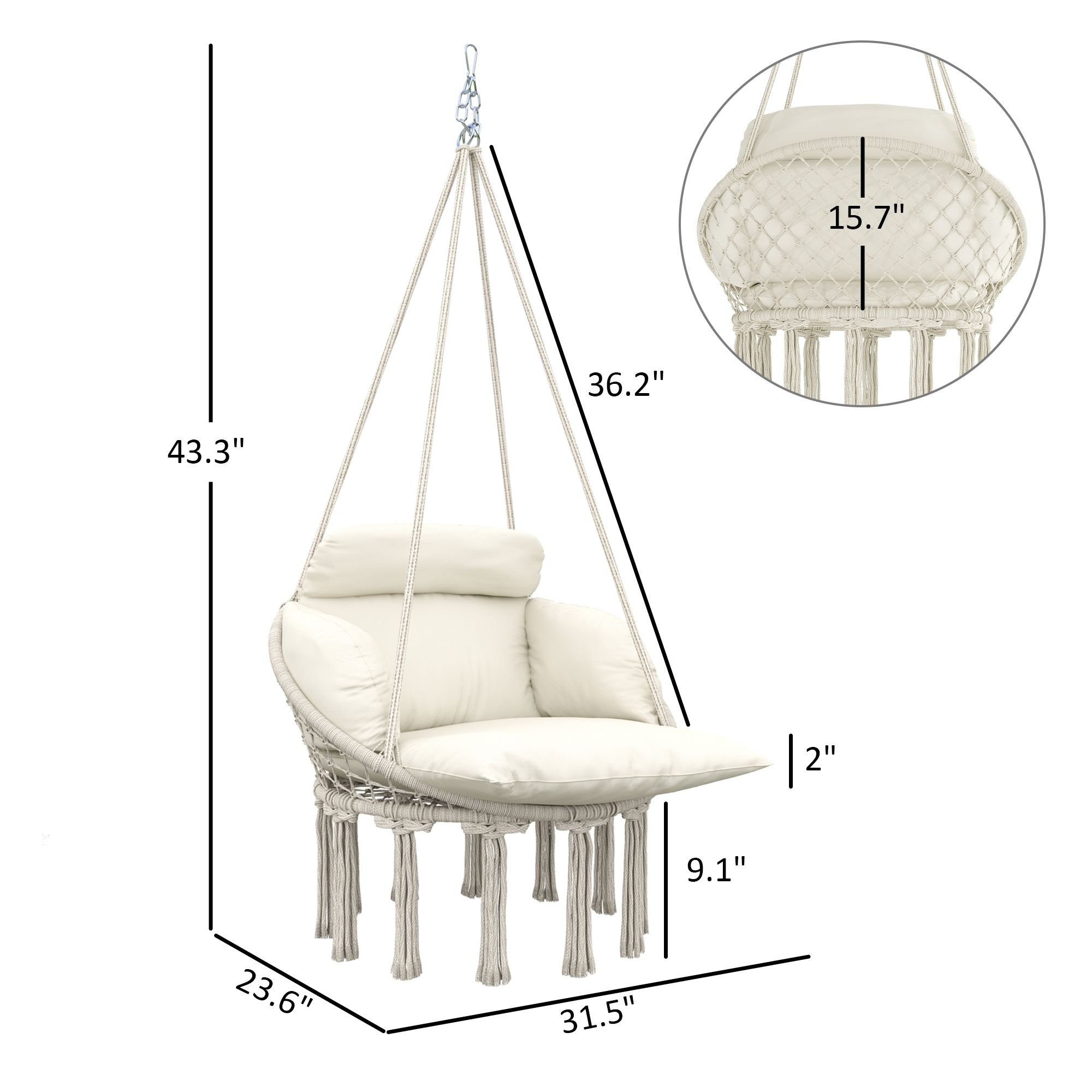 5.- Hanging Swing Chair Information: Overall dimension: 31.5" W x 23.6" D x 15.7" H. Weight capacity: 265 lbs. No assembly required, ready to use