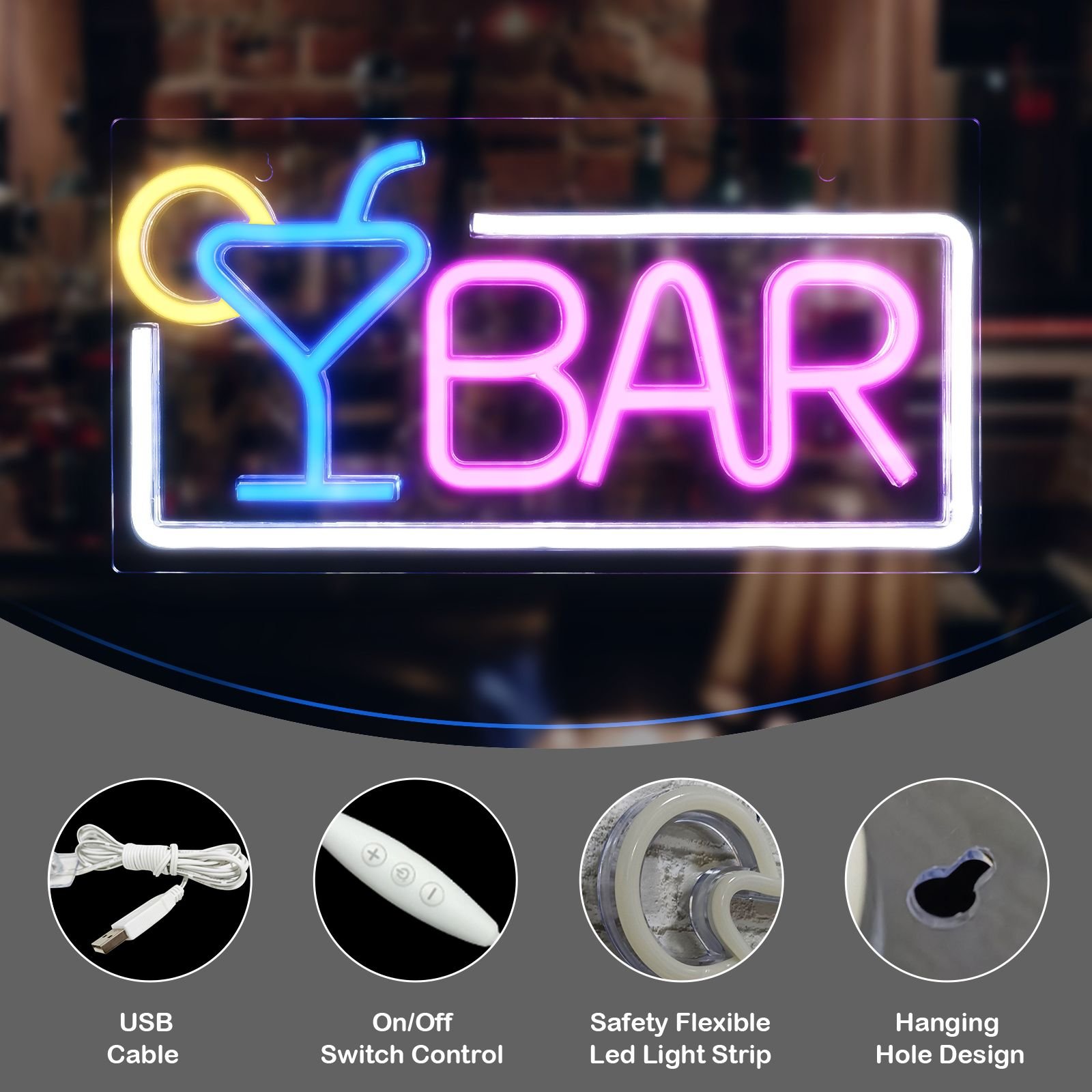 1.Bar Neon Sign:The size of neon bar sign is 16.5 x 8.7 inches. Perfect combination of bright pink bar and blue cocktail light design, make a statement and instantly create the dynamic and stylish atmosphere you want. Add some romantic and relaxed atmosphere with these neon beer signs, light up the decor in any room Great atmosphere, enjoy your drink and have a great time.