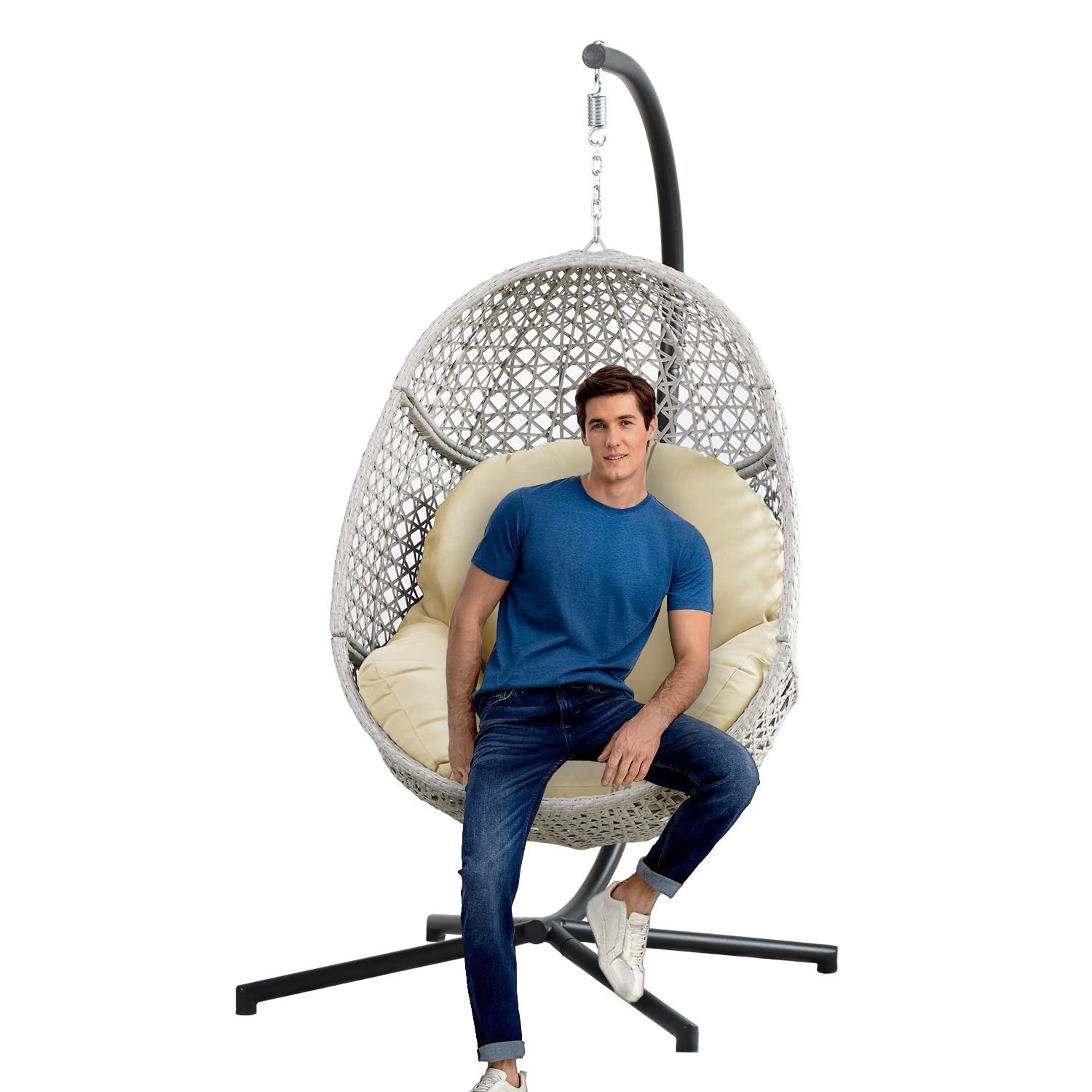 3.Elegant Chair: Beige PE rattan egg shaped hanging chair with gray cushion, whether placed in your bedroom, living room, balcony, patio, or garden, it is an ideal addition.