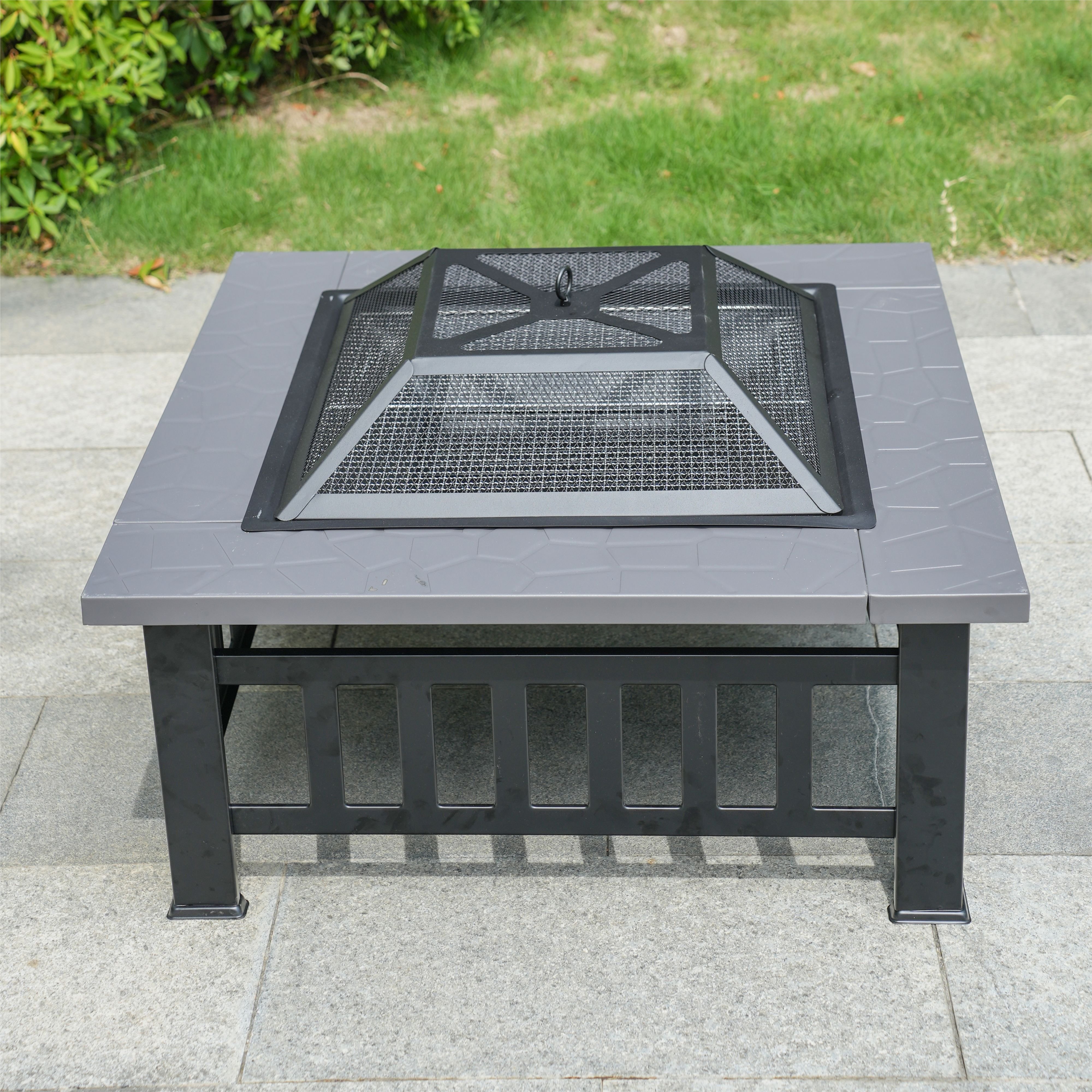Experience the warmth and ambiance of a real wood-burning fire with this durable outdoor fire pit table. Measuring 31.90" x 31.90" x 14.96" and weighing just 12.5 lbs, this fire pit is perfect for your patio, garden, or camping trips. Constructed from powder-coated steel with high-temperature plastic coating and rust-resistant treatment, it is built to withstand the elements. The fire pit includes essential accessories such as a fire poker, wood rack, mesh cover, fabric cover, grill grate made of 201 stainless steel, and tongs, making it a versatile and complete outdoor heating solution.